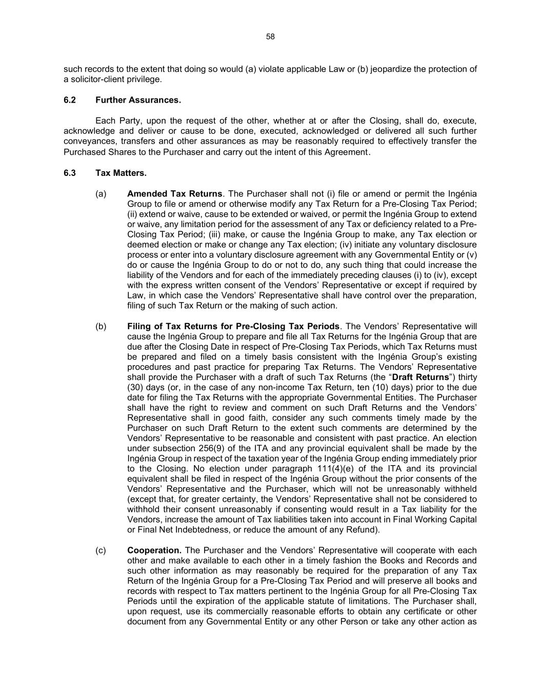 58 such records to the extent that doing so would (a) violate applicable Law or (b) jeopardize the protection of a solicitor-client privilege. 6.2 Further Assurances. Each Party, upon the request of the other, whether at or after the Closing, shall do, execute, acknowledge and deliver or cause to be done, executed, acknowledged or delivered all such further conveyances, transfers and other assurances as may be reasonably required to effectively transfer the Purchased Shares to the Purchaser and carry out the intent of this Agreement. 6.3 Tax Matters. (a) Amended Tax Returns. The Purchaser shall not (i) file or amend or permit the Ingénia Group to file or amend or otherwise modify any Tax Return for a Pre-Closing Tax Period; (ii) extend or waive, cause to be extended or waived, or permit the Ingénia Group to extend or waive, any limitation period for the assessment of any Tax or deficiency related to a Pre- Closing Tax Period; (iii) make, or cause the Ingénia Group to make, any Tax election or deemed election or make or change any Tax election; (iv) initiate any voluntary disclosure process or enter into a voluntary disclosure agreement with any Governmental Entity or (v) do or cause the Ingénia Group to do or not to do, any such thing that could increase the liability of the Vendors and for each of the immediately preceding clauses (i) to (iv), except with the express written consent of the Vendors’ Representative or except if required by Law, in which case the Vendors’ Representative shall have control over the preparation, filing of such Tax Return or the making of such action. (b) Filing of Tax Returns for Pre-Closing Tax Periods. The Vendors’ Representative will cause the Ingénia Group to prepare and file all Tax Returns for the Ingénia Group that are due after the Closing Date in respect of Pre-Closing Tax Periods, which Tax Returns must be prepared and filed on a timely basis consistent with the Ingénia Group’s existing procedures and past practice for preparing Tax Returns. The Vendors’ Representative shall provide the Purchaser with a draft of such Tax Returns (the “Draft Returns”) thirty (30) days (or, in the case of any non-income Tax Return, ten (10) days) prior to the due date for filing the Tax Returns with the appropriate Governmental Entities. The Purchaser shall have the right to review and comment on such Draft Returns and the Vendors’ Representative shall in good faith, consider any such comments timely made by the Purchaser on such Draft Return to the extent such comments are determined by the Vendors’ Representative to be reasonable and consistent with past practice. An election under subsection 256(9) of the ITA and any provincial equivalent shall be made by the Ingénia Group in respect of the taxation year of the Ingénia Group ending immediately prior to the Closing. No election under paragraph 111(4)(e) of the ITA and its provincial equivalent shall be filed in respect of the Ingénia Group without the prior consents of the Vendors’ Representative and the Purchaser, which will not be unreasonably withheld (except that, for greater certainty, the Vendors’ Representative shall not be considered to withhold their consent unreasonably if consenting would result in a Tax liability for the Vendors, increase the amount of Tax liabilities taken into account in Final Working Capital or Final Net Indebtedness, or reduce the amount of any Refund). (c) Cooperation. The Purchaser and the Vendors’ Representative will cooperate with each other and make available to each other in a timely fashion the Books and Records and such other information as may reasonably be required for the preparation of any Tax Return of the Ingénia Group for a Pre-Closing Tax Period and will preserve all books and records with respect to Tax matters pertinent to the Ingénia Group for all Pre-Closing Tax Periods until the expiration of the applicable statute of limitations. The Purchaser shall, upon request, use its commercially reasonable efforts to obtain any certificate or other document from any Governmental Entity or any other Person or take any other action as