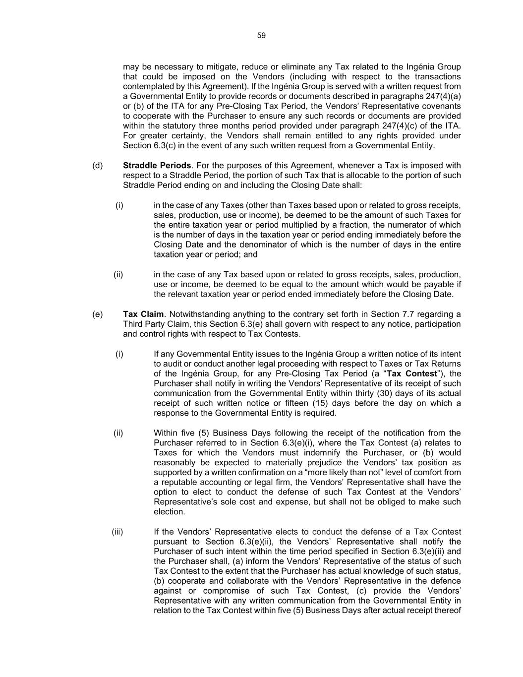 59 may be necessary to mitigate, reduce or eliminate any Tax related to the Ingénia Group that could be imposed on the Vendors (including with respect to the transactions contemplated by this Agreement). If the Ingénia Group is served with a written request from a Governmental Entity to provide records or documents described in paragraphs 247(4)(a) or (b) of the ITA for any Pre-Closing Tax Period, the Vendors’ Representative covenants to cooperate with the Purchaser to ensure any such records or documents are provided within the statutory three months period provided under paragraph 247(4)(c) of the ITA. For greater certainty, the Vendors shall remain entitled to any rights provided under Section 6.3(c) in the event of any such written request from a Governmental Entity. (d) Straddle Periods. For the purposes of this Agreement, whenever a Tax is imposed with respect to a Straddle Period, the portion of such Tax that is allocable to the portion of such Straddle Period ending on and including the Closing Date shall: (i) in the case of any Taxes (other than Taxes based upon or related to gross receipts, sales, production, use or income), be deemed to be the amount of such Taxes for the entire taxation year or period multiplied by a fraction, the numerator of which is the number of days in the taxation year or period ending immediately before the Closing Date and the denominator of which is the number of days in the entire taxation year or period; and (ii) in the case of any Tax based upon or related to gross receipts, sales, production, use or income, be deemed to be equal to the amount which would be payable if the relevant taxation year or period ended immediately before the Closing Date. (e) Tax Claim. Notwithstanding anything to the contrary set forth in Section 7.7 regarding a Third Party Claim, this Section 6.3(e) shall govern with respect to any notice, participation and control rights with respect to Tax Contests. (i) If any Governmental Entity issues to the Ingénia Group a written notice of its intent to audit or conduct another legal proceeding with respect to Taxes or Tax Returns of the Ingénia Group, for any Pre-Closing Tax Period (a “Tax Contest”), the Purchaser shall notify in writing the Vendors’ Representative of its receipt of such communication from the Governmental Entity within thirty (30) days of its actual receipt of such written notice or fifteen (15) days before the day on which a response to the Governmental Entity is required. (ii) Within five (5) Business Days following the receipt of the notification from the Purchaser referred to in Section 6.3(e)(i), where the Tax Contest (a) relates to Taxes for which the Vendors must indemnify the Purchaser, or (b) would reasonably be expected to materially prejudice the Vendors’ tax position as supported by a written confirmation on a “more likely than not” level of comfort from a reputable accounting or legal firm, the Vendors’ Representative shall have the option to elect to conduct the defense of such Tax Contest at the Vendors’ Representative’s sole cost and expense, but shall not be obliged to make such election. (iii) If the Vendors’ Representative elects to conduct the defense of a Tax Contest pursuant to Section 6.3(e)(ii), the Vendors’ Representative shall notify the Purchaser of such intent within the time period specified in Section 6.3(e)(ii) and the Purchaser shall, (a) inform the Vendors’ Representative of the status of such Tax Contest to the extent that the Purchaser has actual knowledge of such status, (b) cooperate and collaborate with the Vendors’ Representative in the defence against or compromise of such Tax Contest, (c) provide the Vendors’ Representative with any written communication from the Governmental Entity in relation to the Tax Contest within five (5) Business Days after actual receipt thereof