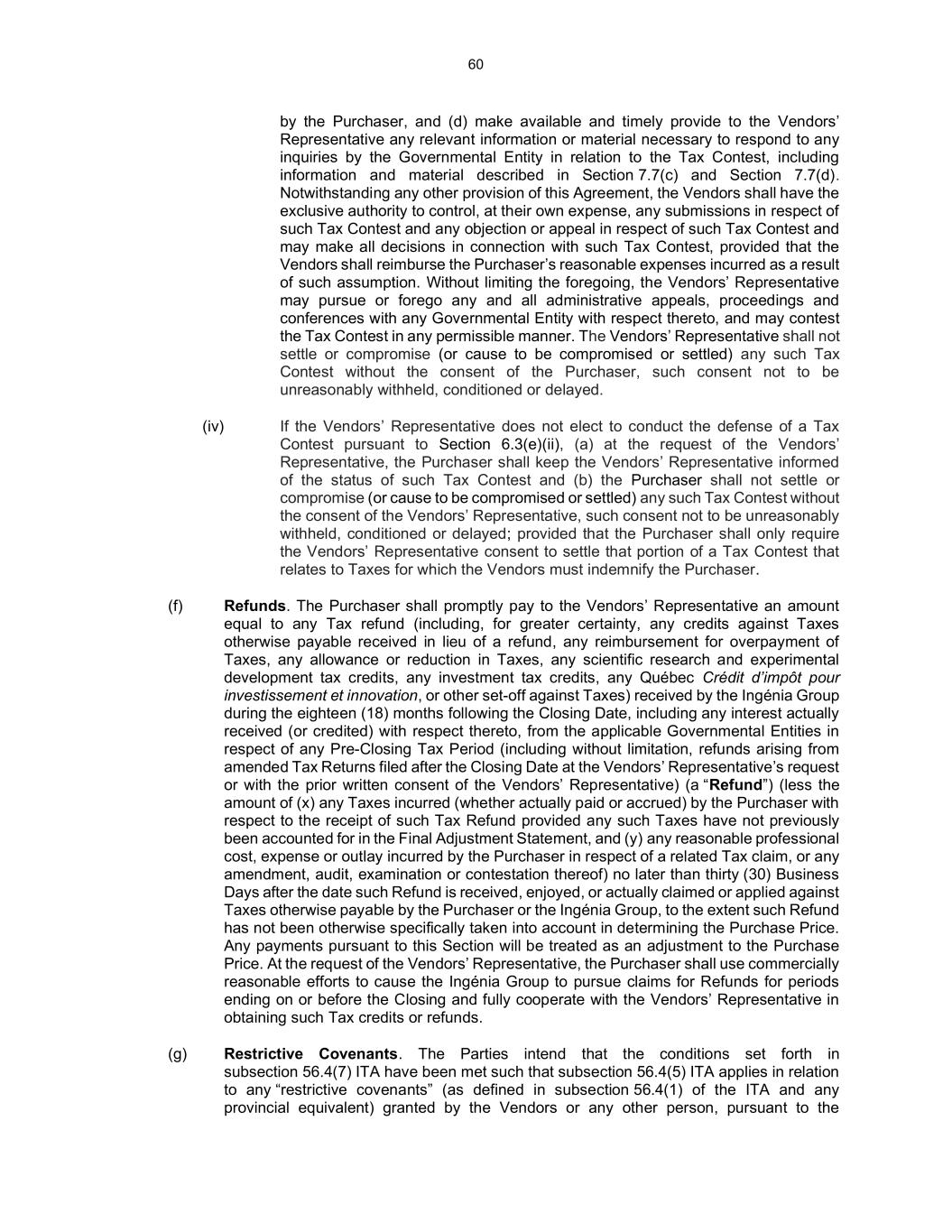60 by the Purchaser, and (d) make available and timely provide to the Vendors’ Representative any relevant information or material necessary to respond to any inquiries by the Governmental Entity in relation to the Tax Contest, including information and material described in Section 7.7(c) and Section 7.7(d). Notwithstanding any other provision of this Agreement, the Vendors shall have the exclusive authority to control, at their own expense, any submissions in respect of such Tax Contest and any objection or appeal in respect of such Tax Contest and may make all decisions in connection with such Tax Contest, provided that the Vendors shall reimburse the Purchaser’s reasonable expenses incurred as a result of such assumption. Without limiting the foregoing, the Vendors’ Representative may pursue or forego any and all administrative appeals, proceedings and conferences with any Governmental Entity with respect thereto, and may contest the Tax Contest in any permissible manner. The Vendors’ Representative shall not settle or compromise (or cause to be compromised or settled) any such Tax Contest without the consent of the Purchaser, such consent not to be unreasonably withheld, conditioned or delayed. (iv) If the Vendors’ Representative does not elect to conduct the defense of a Tax Contest pursuant to Section 6.3(e)(ii), (a) at the request of the Vendors’ Representative, the Purchaser shall keep the Vendors’ Representative informed of the status of such Tax Contest and (b) the Purchaser shall not settle or compromise (or cause to be compromised or settled) any such Tax Contest without the consent of the Vendors’ Representative, such consent not to be unreasonably withheld, conditioned or delayed; provided that the Purchaser shall only require the Vendors’ Representative consent to settle that portion of a Tax Contest that relates to Taxes for which the Vendors must indemnify the Purchaser. (f) Refunds. The Purchaser shall promptly pay to the Vendors’ Representative an amount equal to any Tax refund (including, for greater certainty, any credits against Taxes otherwise payable received in lieu of a refund, any reimbursement for overpayment of Taxes, any allowance or reduction in Taxes, any scientific research and experimental development tax credits, any investment tax credits, any Québec Crédit d’impôt pour investissement et innovation, or other set-off against Taxes) received by the Ingénia Group during the eighteen (18) months following the Closing Date, including any interest actually received (or credited) with respect thereto, from the applicable Governmental Entities in respect of any Pre-Closing Tax Period (including without limitation, refunds arising from amended Tax Returns filed after the Closing Date at the Vendors’ Representative’s request or with the prior written consent of the Vendors’ Representative) (a “Refund”) (less the amount of (x) any Taxes incurred (whether actually paid or accrued) by the Purchaser with respect to the receipt of such Tax Refund provided any such Taxes have not previously been accounted for in the Final Adjustment Statement, and (y) any reasonable professional cost, expense or outlay incurred by the Purchaser in respect of a related Tax claim, or any amendment, audit, examination or contestation thereof) no later than thirty (30) Business Days after the date such Refund is received, enjoyed, or actually claimed or applied against Taxes otherwise payable by the Purchaser or the Ingénia Group, to the extent such Refund has not been otherwise specifically taken into account in determining the Purchase Price. Any payments pursuant to this Section will be treated as an adjustment to the Purchase Price. At the request of the Vendors’ Representative, the Purchaser shall use commercially reasonable efforts to cause the Ingénia Group to pursue claims for Refunds for periods ending on or before the Closing and fully cooperate with the Vendors’ Representative in obtaining such Tax credits or refunds. (g) Restrictive Covenants. The Parties intend that the conditions set forth in subsection 56.4(7) ITA have been met such that subsection 56.4(5) ITA applies in relation to any “restrictive covenants” (as defined in subsection 56.4(1) of the ITA and any provincial equivalent) granted by the Vendors or any other person, pursuant to the