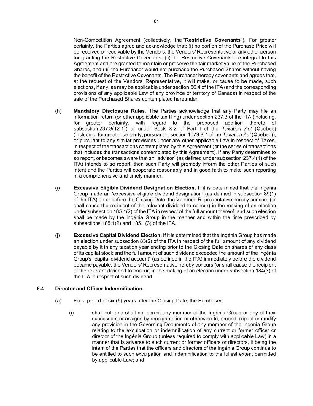 61 Non-Competition Agreement (collectively, the “Restrictive Covenants”). For greater certainty, the Parties agree and acknowledge that: (i) no portion of the Purchase Price will be received or receivable by the Vendors, the Vendors’ Representative or any other person for granting the Restrictive Covenants, (ii) the Restrictive Covenants are integral to this Agreement and are granted to maintain or preserve the fair market value of the Purchased Shares, and (iii) the Purchaser would not purchase the Purchased Shares without having the benefit of the Restrictive Covenants. The Purchaser hereby covenants and agrees that, at the request of the Vendors’ Representative, it will make, or cause to be made, such elections, if any, as may be applicable under section 56.4 of the ITA (and the corresponding provisions of any applicable Law of any province or territory of Canada) in respect of the sale of the Purchased Shares contemplated hereunder. (h) Mandatory Disclosure Rules. The Parties acknowledge that any Party may file an information return (or other applicable tax filing) under section 237.3 of the ITA (including, for greater certainty, with regard to the proposed addition thereto of subsection 237.3(12.1)) or under Book X.2 of Part I of the Taxation Act (Québec) (including, for greater certainty, pursuant to section 1079.8.7 of the Taxation Act (Québec)), or pursuant to any similar provisions under any other applicable Law in respect of Taxes, in respect of the transactions contemplated by this Agreement (or the series of transactions that includes the transactions contemplated by this Agreement). If any Party determines to so report, or becomes aware that an “advisor” (as defined under subsection 237.4(1) of the ITA) intends to so report, then such Party will promptly inform the other Parties of such intent and the Parties will cooperate reasonably and in good faith to make such reporting in a comprehensive and timely manner. (i) Excessive Eligible Dividend Designation Election. If it is determined that the Ingénia Group made an “excessive eligible dividend designation” (as defined in subsection 89(1) of the ITA) on or before the Closing Date, the Vendors’ Representative hereby concurs (or shall cause the recipient of the relevant dividend to concur) in the making of an election under subsection 185.1(2) of the ITA in respect of the full amount thereof, and such election shall be made by the Ingénia Group in the manner and within the time prescribed by subsections 185.1(2) and 185.1(3) of the ITA. (j) Excessive Capital Dividend Election. If it is determined that the Ingénia Group has made an election under subsection 83(2) of the ITA in respect of the full amount of any dividend payable by it in any taxation year ending prior to the Closing Date on shares of any class of its capital stock and the full amount of such dividend exceeded the amount of the Ingénia Group’s “capital dividend account” (as defined in the ITA) immediately before the dividend became payable, the Vendors’ Representative hereby concurs (or shall cause the recipient of the relevant dividend to concur) in the making of an election under subsection 184(3) of the ITA in respect of such dividend. 6.4 Director and Officer Indemnification. (a) For a period of six (6) years after the Closing Date, the Purchaser: (i) shall not, and shall not permit any member of the Ingénia Group or any of their successors or assigns by amalgamation or otherwise to, amend, repeal or modify any provision in the Governing Documents of any member of the Ingénia Group relating to the exculpation or indemnification of any current or former officer or director of the Ingénia Group (unless required to comply with applicable Law) in a manner that is adverse to such current or former officers or directors, it being the intent of the Parties that the officers and directors of the Ingénia Group continue to be entitled to such exculpation and indemnification to the fullest extent permitted by applicable Law; and