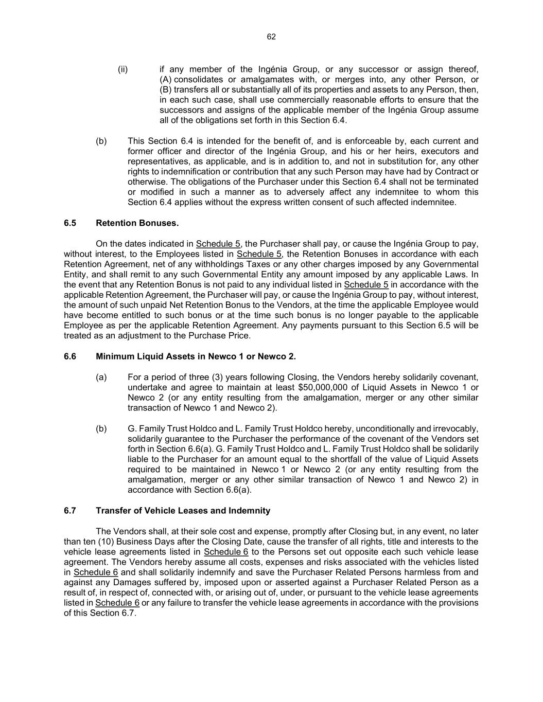 62 (ii) if any member of the Ingénia Group, or any successor or assign thereof, (A) consolidates or amalgamates with, or merges into, any other Person, or (B) transfers all or substantially all of its properties and assets to any Person, then, in each such case, shall use commercially reasonable efforts to ensure that the successors and assigns of the applicable member of the Ingénia Group assume all of the obligations set forth in this Section 6.4. (b) This Section 6.4 is intended for the benefit of, and is enforceable by, each current and former officer and director of the Ingénia Group, and his or her heirs, executors and representatives, as applicable, and is in addition to, and not in substitution for, any other rights to indemnification or contribution that any such Person may have had by Contract or otherwise. The obligations of the Purchaser under this Section 6.4 shall not be terminated or modified in such a manner as to adversely affect any indemnitee to whom this Section 6.4 applies without the express written consent of such affected indemnitee. 6.5 Retention Bonuses. On the dates indicated in Schedule 5, the Purchaser shall pay, or cause the Ingénia Group to pay, without interest, to the Employees listed in Schedule 5, the Retention Bonuses in accordance with each Retention Agreement, net of any withholdings Taxes or any other charges imposed by any Governmental Entity, and shall remit to any such Governmental Entity any amount imposed by any applicable Laws. In the event that any Retention Bonus is not paid to any individual listed in Schedule 5 in accordance with the applicable Retention Agreement, the Purchaser will pay, or cause the Ingénia Group to pay, without interest, the amount of such unpaid Net Retention Bonus to the Vendors, at the time the applicable Employee would have become entitled to such bonus or at the time such bonus is no longer payable to the applicable Employee as per the applicable Retention Agreement. Any payments pursuant to this Section 6.5 will be treated as an adjustment to the Purchase Price. 6.6 Minimum Liquid Assets in Newco 1 or Newco 2. (a) For a period of three (3) years following Closing, the Vendors hereby solidarily covenant, undertake and agree to maintain at least $50,000,000 of Liquid Assets in Newco 1 or Newco 2 (or any entity resulting from the amalgamation, merger or any other similar transaction of Newco 1 and Newco 2). (b) G. Family Trust Holdco and L. Family Trust Holdco hereby, unconditionally and irrevocably, solidarily guarantee to the Purchaser the performance of the covenant of the Vendors set forth in Section 6.6(a). G. Family Trust Holdco and L. Family Trust Holdco shall be solidarily liable to the Purchaser for an amount equal to the shortfall of the value of Liquid Assets required to be maintained in Newco 1 or Newco 2 (or any entity resulting from the amalgamation, merger or any other similar transaction of Newco 1 and Newco 2) in accordance with Section 6.6(a). 6.7 Transfer of Vehicle Leases and Indemnity The Vendors shall, at their sole cost and expense, promptly after Closing but, in any event, no later than ten (10) Business Days after the Closing Date, cause the transfer of all rights, title and interests to the vehicle lease agreements listed in Schedule 6 to the Persons set out opposite each such vehicle lease agreement. The Vendors hereby assume all costs, expenses and risks associated with the vehicles listed in Schedule 6 and shall solidarily indemnify and save the Purchaser Related Persons harmless from and against any Damages suffered by, imposed upon or asserted against a Purchaser Related Person as a result of, in respect of, connected with, or arising out of, under, or pursuant to the vehicle lease agreements listed in Schedule 6 or any failure to transfer the vehicle lease agreements in accordance with the provisions of this Section 6.7.
