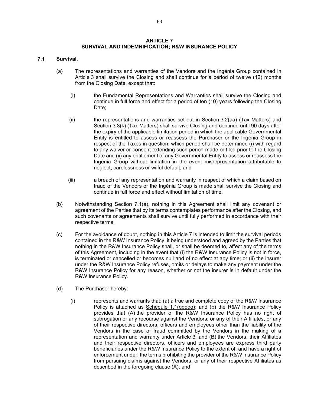 63 ARTICLE 7 SURVIVAL AND INDEMNIFICATION; R&W INSURANCE POLICY 7.1 Survival. (a) The representations and warranties of the Vendors and the Ingénia Group contained in Article 3 shall survive the Closing and shall continue for a period of twelve (12) months from the Closing Date, except that: (i) the Fundamental Representations and Warranties shall survive the Closing and continue in full force and effect for a period of ten (10) years following the Closing Date; (ii) the representations and warranties set out in Section 3.2(aa) (Tax Matters) and Section 3.3(k) (Tax Matters) shall survive Closing and continue until 90 days after the expiry of the applicable limitation period in which the applicable Governmental Entity is entitled to assess or reassess the Purchaser or the Ingénia Group in respect of the Taxes in question, which period shall be determined (i) with regard to any waiver or consent extending such period made or filed prior to the Closing Date and (ii) any entitlement of any Governmental Entity to assess or reassess the Ingénia Group without limitation in the event misrepresentation attributable to neglect, carelessness or wilful default; and (iii) a breach of any representation and warranty in respect of which a claim based on fraud of the Vendors or the Ingénia Group is made shall survive the Closing and continue in full force and effect without limitation of time. (b) Notwithstanding Section 7.1(a), nothing in this Agreement shall limit any covenant or agreement of the Parties that by its terms contemplates performance after the Closing, and such covenants or agreements shall survive until fully performed in accordance with their respective terms. (c) For the avoidance of doubt, nothing in this Article 7 is intended to limit the survival periods contained in the R&W Insurance Policy, it being understood and agreed by the Parties that nothing in the R&W Insurance Policy shall, or shall be deemed to, affect any of the terms of this Agreement, including in the event that (i) the R&W Insurance Policy is not in force, is terminated or cancelled or becomes null and of no effect at any time; or (ii) the insurer under the R&W Insurance Policy refuses, omits or delays to make any payment under the R&W Insurance Policy for any reason, whether or not the insurer is in default under the R&W Insurance Policy. (d) The Purchaser hereby: (i) represents and warrants that: (a) a true and complete copy of the R&W Insurance Policy is attached as Schedule 1.1(ggggg); and (b) the R&W Insurance Policy provides that (A) the provider of the R&W Insurance Policy has no right of subrogation or any recourse against the Vendors, or any of their Affiliates, or any of their respective directors, officers and employees other than the liability of the Vendors in the case of fraud committed by the Vendors in the making of a representation and warranty under Article 3; and (B) the Vendors, their Affiliates and their respective directors, officers and employees are express third party beneficiaries under the R&W Insurance Policy to the extent of, and have a right of enforcement under, the terms prohibiting the provider of the R&W Insurance Policy from pursuing claims against the Vendors, or any of their respective Affiliates as described in the foregoing clause (A); and