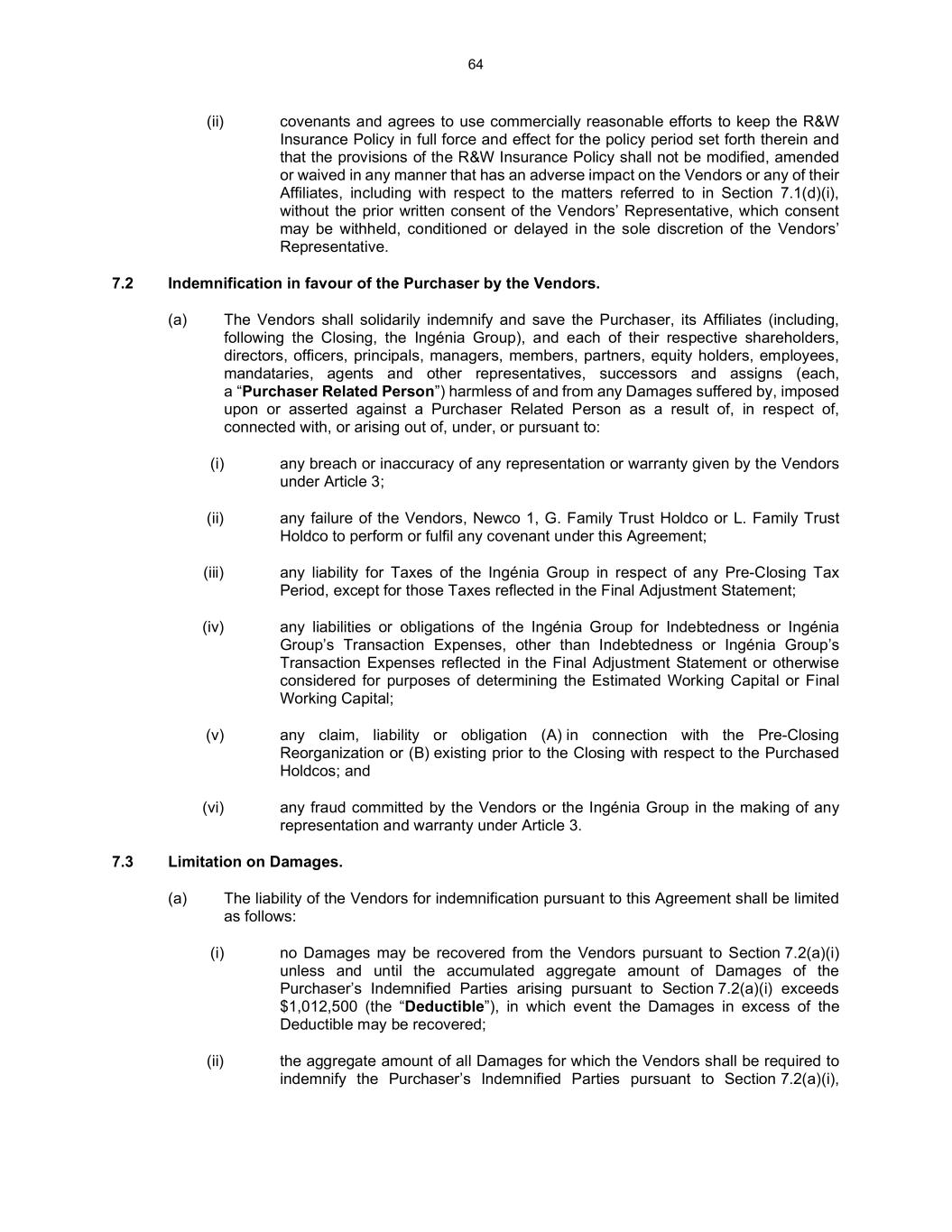 64 (ii) covenants and agrees to use commercially reasonable efforts to keep the R&W Insurance Policy in full force and effect for the policy period set forth therein and that the provisions of the R&W Insurance Policy shall not be modified, amended or waived in any manner that has an adverse impact on the Vendors or any of their Affiliates, including with respect to the matters referred to in Section 7.1(d)(i), without the prior written consent of the Vendors’ Representative, which consent may be withheld, conditioned or delayed in the sole discretion of the Vendors’ Representative. 7.2 Indemnification in favour of the Purchaser by the Vendors. (a) The Vendors shall solidarily indemnify and save the Purchaser, its Affiliates (including, following the Closing, the Ingénia Group), and each of their respective shareholders, directors, officers, principals, managers, members, partners, equity holders, employees, mandataries, agents and other representatives, successors and assigns (each, a “Purchaser Related Person”) harmless of and from any Damages suffered by, imposed upon or asserted against a Purchaser Related Person as a result of, in respect of, connected with, or arising out of, under, or pursuant to: (i) any breach or inaccuracy of any representation or warranty given by the Vendors under Article 3; (ii) any failure of the Vendors, Newco 1, G. Family Trust Holdco or L. Family Trust Holdco to perform or fulfil any covenant under this Agreement; (iii) any liability for Taxes of the Ingénia Group in respect of any Pre-Closing Tax Period, except for those Taxes reflected in the Final Adjustment Statement; (iv) any liabilities or obligations of the Ingénia Group for Indebtedness or Ingénia Group’s Transaction Expenses, other than Indebtedness or Ingénia Group’s Transaction Expenses reflected in the Final Adjustment Statement or otherwise considered for purposes of determining the Estimated Working Capital or Final Working Capital; (v) any claim, liability or obligation (A) in connection with the Pre-Closing Reorganization or (B) existing prior to the Closing with respect to the Purchased Holdcos; and (vi) any fraud committed by the Vendors or the Ingénia Group in the making of any representation and warranty under Article 3. 7.3 Limitation on Damages. (a) The liability of the Vendors for indemnification pursuant to this Agreement shall be limited as follows: (i) no Damages may be recovered from the Vendors pursuant to Section 7.2(a)(i) unless and until the accumulated aggregate amount of Damages of the Purchaser’s Indemnified Parties arising pursuant to Section 7.2(a)(i) exceeds $1,012,500 (the “Deductible”), in which event the Damages in excess of the Deductible may be recovered; (ii) the aggregate amount of all Damages for which the Vendors shall be required to indemnify the Purchaser’s Indemnified Parties pursuant to Section 7.2(a)(i),