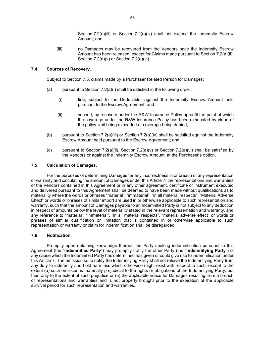 65 Section 7.2(a)(iii) or Section 7.2(a)(iv) shall not exceed the Indemnity Escrow Amount; and (iii) no Damages may be recovered from the Vendors once the Indemnity Escrow Amount has been released, except for Claims made pursuant to Section 7.2(a)(ii), Section 7.2(a)(v) or Section 7.2(a)(vi). 7.4 Sources of Recovery. Subject to Section 7.3, claims made by a Purchaser Related Person for Damages: (a) pursuant to Section 7.2(a)(i) shall be satisfied in the following order: (i) first, subject to the Deductible, against the Indemnity Escrow Amount held pursuant to the Escrow Agreement; and (ii) second, by recovery under the R&W Insurance Policy up until the point at which the coverage under the R&W Insurance Policy has been exhausted by virtue of the policy limit being exceeded or coverage being denied; (b) pursuant to Section 7.2(a)(iii) or Section 7.2(a)(iv) shall be satisfied against the Indemnity Escrow Amount held pursuant to the Escrow Agreement; and (c) pursuant to Section 7.2(a)(ii), Section 7.2(a)(v) or Section 7.2(a)(vi) shall be satisfied by the Vendors or against the Indemnity Escrow Amount, at the Purchaser’s option. 7.5 Calculation of Damages. For the purposes of determining Damages for any incorrectness in or breach of any representation or warranty and calculating the amount of Damages under this Article 7, the representations and warranties of the Vendors contained in this Agreement or in any other agreement, certificate or instrument executed and delivered pursuant to this Agreement shall be deemed to have been made without qualifications as to materiality where the words or phrases “material”, “immaterial”, “in all material respects”, “Material Adverse Effect” or words or phrases of similar import are used in or otherwise applicable to such representation and warranty, such that the amount of Damages payable to an Indemnified Party is not subject to any deduction in respect of amounts below the level of materiality stated in the relevant representation and warranty, and any reference to “material”, “immaterial”, “in all material respects”, “material adverse effect” or words or phrases of similar qualification or limitation that is contained in or otherwise applicable to such representation or warranty or claim for indemnification shall be disregarded. 7.6 Notification. Promptly upon obtaining knowledge thereof, the Party seeking indemnification pursuant to this Agreement (the “Indemnified Party”) may promptly notify the other Party (the “Indemnifying Party”) of any cause which the Indemnified Party has determined has given or could give rise to indemnification under this Article 7. The omission so to notify the Indemnifying Party shall not relieve the Indemnifying Party from any duty to indemnify and hold harmless which otherwise might exist with respect to such, except to the extent (a) such omission is materially prejudicial to the rights or obligations of the Indemnifying Party, but then only to the extent of such prejudice or (b) the applicable notice for Damages resulting from a breach of representations and warranties and is not properly brought prior to the expiration of the applicable survival period for such representation and warranties.