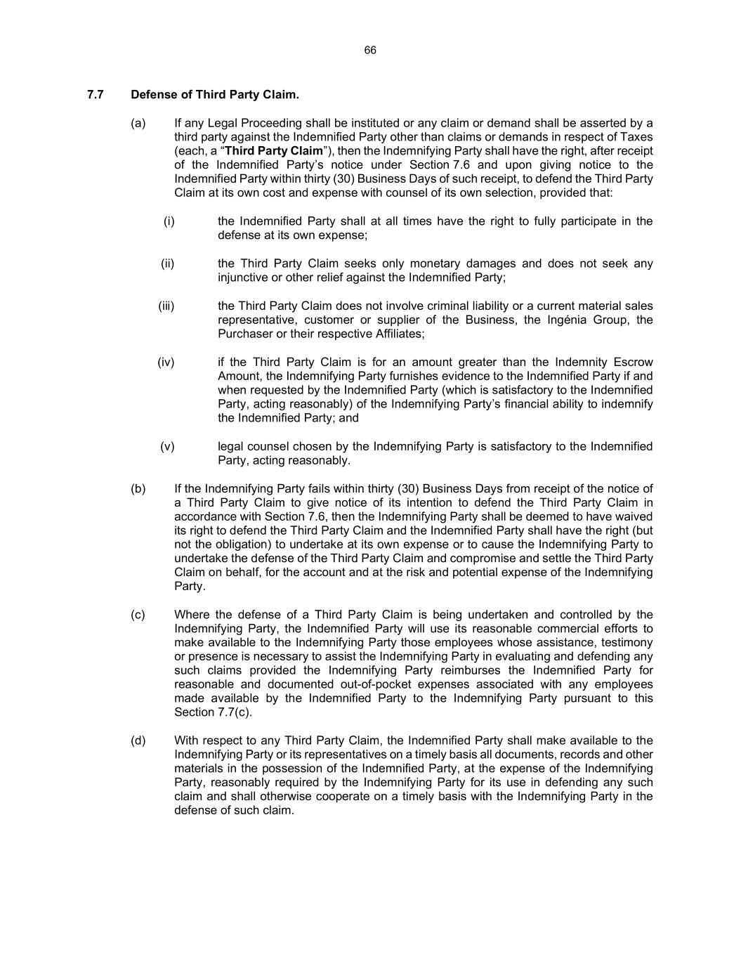 66 7.7 Defense of Third Party Claim. (a) If any Legal Proceeding shall be instituted or any claim or demand shall be asserted by a third party against the Indemnified Party other than claims or demands in respect of Taxes (each, a “Third Party Claim”), then the Indemnifying Party shall have the right, after receipt of the Indemnified Party’s notice under Section 7.6 and upon giving notice to the Indemnified Party within thirty (30) Business Days of such receipt, to defend the Third Party Claim at its own cost and expense with counsel of its own selection, provided that: (i) the Indemnified Party shall at all times have the right to fully participate in the defense at its own expense; (ii) the Third Party Claim seeks only monetary damages and does not seek any injunctive or other relief against the Indemnified Party; (iii) the Third Party Claim does not involve criminal liability or a current material sales representative, customer or supplier of the Business, the Ingénia Group, the Purchaser or their respective Affiliates; (iv) if the Third Party Claim is for an amount greater than the Indemnity Escrow Amount, the Indemnifying Party furnishes evidence to the Indemnified Party if and when requested by the Indemnified Party (which is satisfactory to the Indemnified Party, acting reasonably) of the Indemnifying Party’s financial ability to indemnify the Indemnified Party; and (v) legal counsel chosen by the Indemnifying Party is satisfactory to the Indemnified Party, acting reasonably. (b) If the Indemnifying Party fails within thirty (30) Business Days from receipt of the notice of a Third Party Claim to give notice of its intention to defend the Third Party Claim in accordance with Section 7.6, then the Indemnifying Party shall be deemed to have waived its right to defend the Third Party Claim and the Indemnified Party shall have the right (but not the obligation) to undertake at its own expense or to cause the Indemnifying Party to undertake the defense of the Third Party Claim and compromise and settle the Third Party Claim on behalf, for the account and at the risk and potential expense of the Indemnifying Party. (c) Where the defense of a Third Party Claim is being undertaken and controlled by the Indemnifying Party, the Indemnified Party will use its reasonable commercial efforts to make available to the Indemnifying Party those employees whose assistance, testimony or presence is necessary to assist the Indemnifying Party in evaluating and defending any such claims provided the Indemnifying Party reimburses the Indemnified Party for reasonable and documented out-of-pocket expenses associated with any employees made available by the Indemnified Party to the Indemnifying Party pursuant to this Section 7.7(c). (d) With respect to any Third Party Claim, the Indemnified Party shall make available to the Indemnifying Party or its representatives on a timely basis all documents, records and other materials in the possession of the Indemnified Party, at the expense of the Indemnifying Party, reasonably required by the Indemnifying Party for its use in defending any such claim and shall otherwise cooperate on a timely basis with the Indemnifying Party in the defense of such claim.