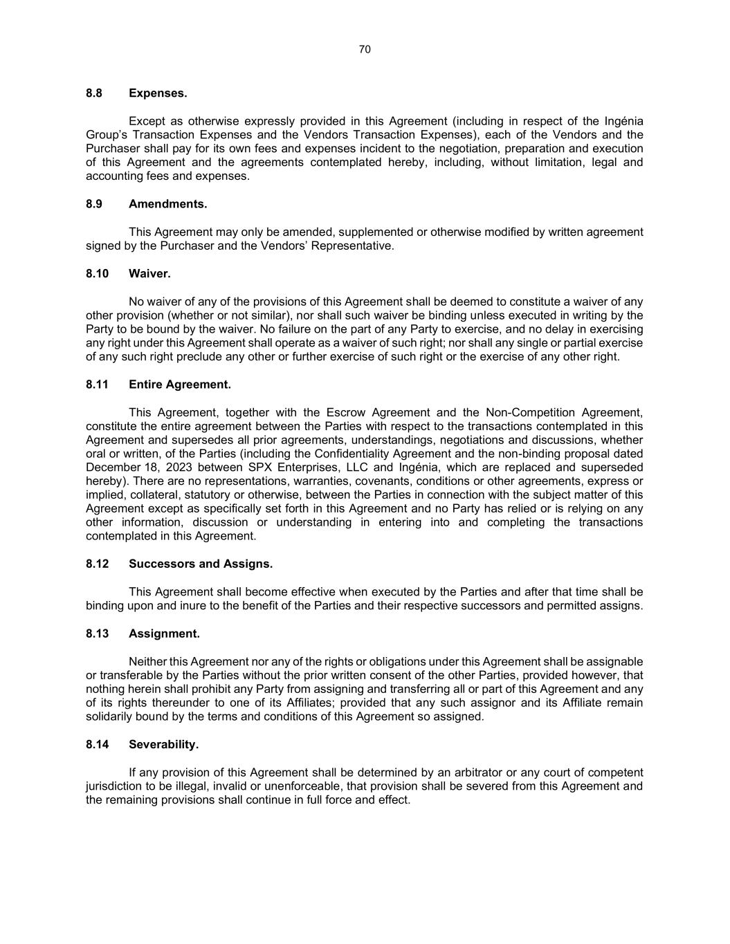 70 8.8 Expenses. Except as otherwise expressly provided in this Agreement (including in respect of the Ingénia Group’s Transaction Expenses and the Vendors Transaction Expenses), each of the Vendors and the Purchaser shall pay for its own fees and expenses incident to the negotiation, preparation and execution of this Agreement and the agreements contemplated hereby, including, without limitation, legal and accounting fees and expenses. 8.9 Amendments. This Agreement may only be amended, supplemented or otherwise modified by written agreement signed by the Purchaser and the Vendors’ Representative. 8.10 Waiver. No waiver of any of the provisions of this Agreement shall be deemed to constitute a waiver of any other provision (whether or not similar), nor shall such waiver be binding unless executed in writing by the Party to be bound by the waiver. No failure on the part of any Party to exercise, and no delay in exercising any right under this Agreement shall operate as a waiver of such right; nor shall any single or partial exercise of any such right preclude any other or further exercise of such right or the exercise of any other right. 8.11 Entire Agreement. This Agreement, together with the Escrow Agreement and the Non-Competition Agreement, constitute the entire agreement between the Parties with respect to the transactions contemplated in this Agreement and supersedes all prior agreements, understandings, negotiations and discussions, whether oral or written, of the Parties (including the Confidentiality Agreement and the non-binding proposal dated December 18, 2023 between SPX Enterprises, LLC and Ingénia, which are replaced and superseded hereby). There are no representations, warranties, covenants, conditions or other agreements, express or implied, collateral, statutory or otherwise, between the Parties in connection with the subject matter of this Agreement except as specifically set forth in this Agreement and no Party has relied or is relying on any other information, discussion or understanding in entering into and completing the transactions contemplated in this Agreement. 8.12 Successors and Assigns. This Agreement shall become effective when executed by the Parties and after that time shall be binding upon and inure to the benefit of the Parties and their respective successors and permitted assigns. 8.13 Assignment. Neither this Agreement nor any of the rights or obligations under this Agreement shall be assignable or transferable by the Parties without the prior written consent of the other Parties, provided however, that nothing herein shall prohibit any Party from assigning and transferring all or part of this Agreement and any of its rights thereunder to one of its Affiliates; provided that any such assignor and its Affiliate remain solidarily bound by the terms and conditions of this Agreement so assigned. 8.14 Severability. If any provision of this Agreement shall be determined by an arbitrator or any court of competent jurisdiction to be illegal, invalid or unenforceable, that provision shall be severed from this Agreement and the remaining provisions shall continue in full force and effect.