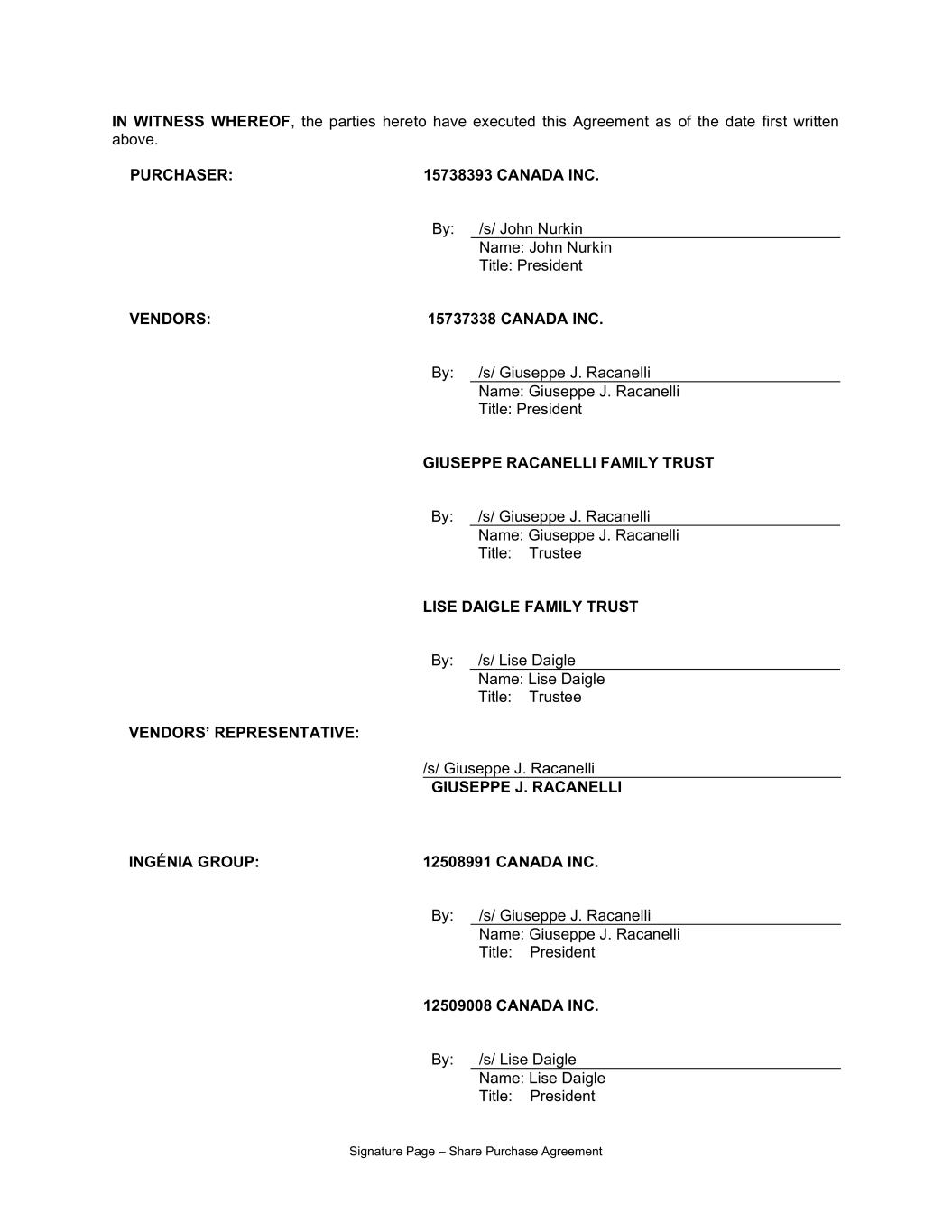 Signature Page – Share Purchase Agreement IN WITNESS WHEREOF, the parties hereto have executed this Agreement as of the date first written above. PURCHASER: 15738393 CANADA INC. By: /s/ John Nurkin Name: John Nurkin Title: President VENDORS: 15737338 CANADA INC. By: /s/ Giuseppe J. Racanelli Name: Giuseppe J. Racanelli Title: President GIUSEPPE RACANELLI FAMILY TRUST By: /s/ Giuseppe J. Racanelli Name: Giuseppe J. Racanelli Title: Trustee LISE DAIGLE FAMILY TRUST By: /s/ Lise Daigle Name: Lise Daigle Title: Trustee VENDORS’ REPRESENTATIVE: /s/ Giuseppe J. Racanelli GIUSEPPE J. RACANELLI INGÉNIA GROUP: 12508991 CANADA INC. By: /s/ Giuseppe J. Racanelli Name: Giuseppe J. Racanelli Title: President 12509008 CANADA INC. By: /s/ Lise Daigle Name: Lise Daigle Title: President