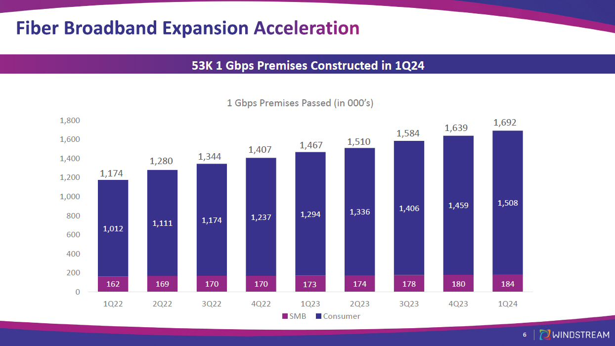 162 169 170 170 173 174 178 180 184 1,012 1,111 1,174 1,237 1,294 1,336 1,406 1,459 1,508 0 200 400 600 800 1,000 1,200 1,400 1,600 1,800 1Q22 2Q22 3Q22 4Q22 1Q23 2Q23 3Q23 4Q23 1Q24 1 Gbps Premises Passed (in 000’s) SMB Consumer 1,174 1,280 1,344 1,407 1,510 1,692 53K 1 Gbps Premises Constructed in 1Q24 1,639 1,584 1,467 6