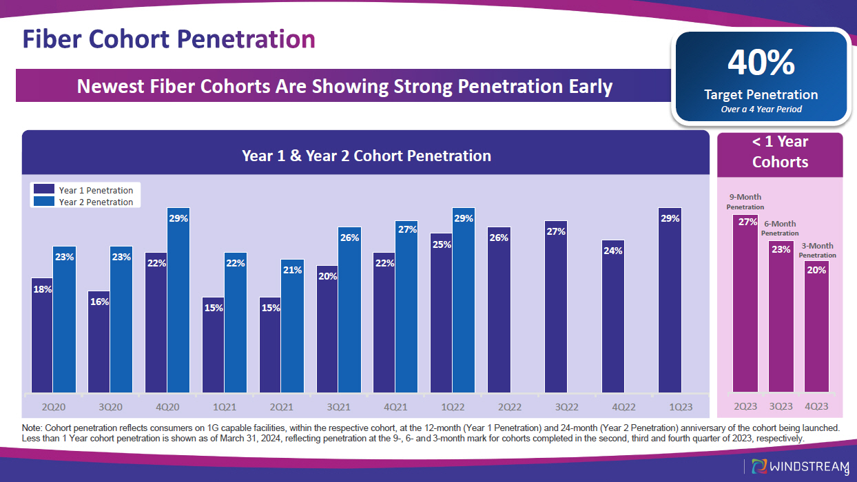 < 1 Year Cohorts 18% 16% 22% 15% 15% 20% 22% 25% 26% 27% 24% 29% 23% 23% 29% 22% 21% 26% 27% 29% 2Q20 3Q20 4Q20 1Q21 2Q21 3Q21 4Q21 1Q22 2Q22 3Q22 4Q22 1Q23 27% 23% 20% 2Q23 3Q23 4Q23 Newest Fiber Cohorts Are Showing Strong Penetration Early Note: Cohort penetration reflects consumers on 1G capable facilities, within the respective cohort, at the 12 - month (Year 1 Penetratio n) and 24 - month (Year 2 Penetration) anniversary of the cohort being launched. Less than 1 Year cohort penetration is shown as of March 31, 2024, reflecting penetration at the 9 - , 6 - and 3 - month mark for coh orts completed in the second, third and fourth quarter of 2023, respectively. 40% Target Penetration Over a 4 Year Period 6 - Month Penetration 3 - Month Penetration Year 1 & Year 2 Cohort Penetration Year 1 Penetration Year 2 Penetration 9 9 - Month Penetration