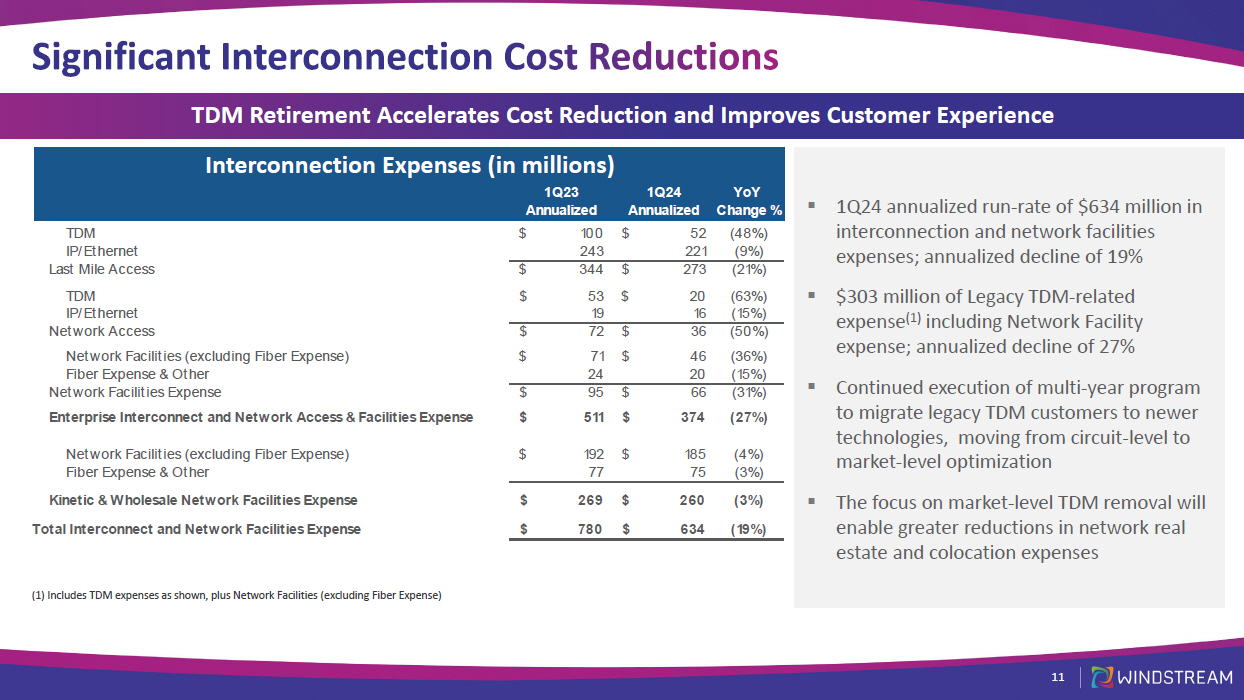 Financial Overview 2023 2023 2023 2023 2023 2024 Q1 Q2 Q3 Q4 YE Q1 Revenue and Sales Kinetic Market 536$ 537$ 530$ 540$ 2,143$ 547$ Enterprise Market 371 338 346 314 1,369 316 Wholesale Market 113 106 115 103 437 114 Service Revenue 1,019$ 980$ 991$ 958$ 3,948$ 977$ Product & Fiber Sales 8 11 11 9 39 24 Total Revenue and Sales 1,027$ 991$ 1,002$ 967$ 3,987$ 1,001$ Expenses Direct Segment Expenses 363$ 358$ 363$ 337$ 1,421$ 343$ Network Access & Facilities 122 119 117 108 467 101 Shared Network & Operations 89 85 84 82 340 79 Information Techology/Shared Corporate 73 69 68 60 271 71 Total Expenses 648$ 631$ 632$ 588$ 2,499$ 595$ Adjusted EBITDAR 380$ 360$ 370$ 379$ 1,488$ 406$ Adjusted EBITDAR Margin % 37.0% 36.3% 36.9% 39.2% 37.3% 40.6% (Dollars in Millions) 10 (1) 1Q24 Adjusted EBITDAR excluding gain on sale of IPv4 assets (1)