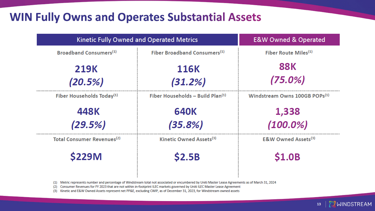 $250 $0 $0 $0 $0 $710 $1,400 $- $250 $500 $750 $1,000 $1,250 $1,500 2023 2024 2025 2026 2027 2028 $475 Debt Maturity as of November 10, 2022 Revolver Draw Note : Available capacity under credit facility excludes outstanding letters of credit of $140.6 million of which $111.0 million w as issued to Universal Service Administrative Company as a condition for Windstream receiving RDOF funding The amended senior secured revolving credit facility will have $500 million of capacity through September 21, 2024, and $475 mil lion of capacity through January 23, 2027 Net Liquidity 1 Net Debt to Adjusted EBITDA First Out Term Loan 1 Net Liquidity calculation includes $500 million revolver capacity through September 2024 Debt Maturity as of March 31, 2024 12 Term Loan Senior First Lien Notes Undrawn Revolver