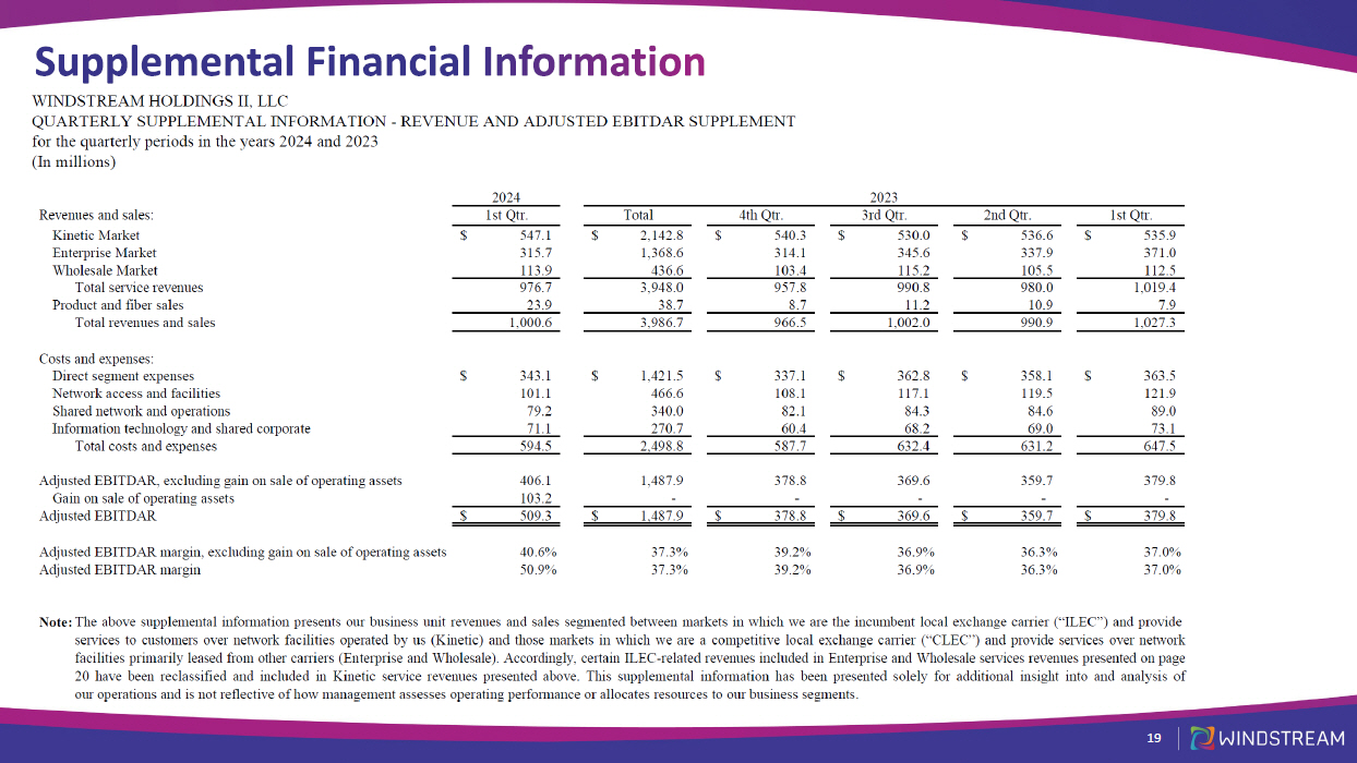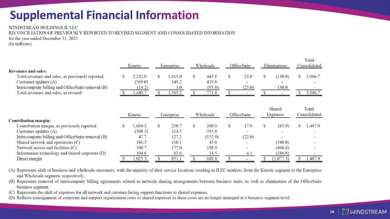 2 This presentation includes forward - looking statements that are subject to risks and uncertainties that could cause actual future events and results to differ materially from those expressed in the forward - looking statements. Forward - looking statements are typically identified by words or phrases such as “wi ll,” “anticipate,” “estimate,” “expect,” “project,” “intend,” “plan,” “believe,” “target,” “forecast” and other words and terms of similar meaning. Forward - looking statements include, but are not limited to, guidance regarding 2024 financial and operational results and our ab ility to successfully execute our 2024 company strategic goals supporting the guidance, including our quality initiatives designed to improve our customer’s experiences; an tic ipated Kinetic broadband subscribers and market penetration growth, including broadband additions; availability and timing of delivery of fiber broadband to customers, inclu din g fiber broadband penetration; number of households or locations that may be served generally and related to funding from various state and federal broadband programs, including fu ture programs, public - private partnerships with government entities, the Rural Digital Opportunity Fund and the Broadband Equity and Access Deployment Program (BEAD); opport uni ties related to strategic sales, products, and strategic revenue growth across all of our business units; statements concerning the CLEC and ILEC Master Leases with Uniti Group, Inc.; expectations regarding expense management activities, including continuation of reduction in interconnection and access expense, and the timing and benefit of such act ivi ties; and any other statements regarding plans, objectives, expectations and intentions and other statements that are not historical facts. These statements, along with othe r f orward - looking statements regarding Windstream’s overall business outlook, are based on estimates, projections, beliefs, and assumptions that Windstream believes are reasonab le but are not guarantees of future events, performance, or results. Actual future events and results may differ materially from those expressed in these forward - looking st atements as the result of a number of important factors. Important factors that could cause actual results to differ materially from those indicated by such forward - looking statements i nclude risks and uncertainties relating to increased competitive pressures as state and federal broadband funding programs provide opportunities for new entrants in our markets and possible overbuilding of our network; our ability to, and the extent to which, we participate in BEAD and are able to successfully secure funding via competitive bidding processes ov er our competitors; loss of funding provided by the Affordable Connectivity Program that may lead to customer disconnects or other state or federal subsidy programs that are not ye t permanent programs; the effect of any changes in federal or state governmental regulations or statutes, including any new regulations regarding alleged digital discrimination an d net neutrality in the marketplace, oversight or enforcement activities by state or federal agencies; adverse changes in economic conditions, including the impact of foreign war s or political upheaval; risks and uncertainties from cost pressures and inflation on our customers’ communications and payment decisions; adverse economic, political or market co ndi tions related to epidemics, pandemics, or disease outbreaks, and the impact of these conditions on our business operations and financial position and on our customers; impact of any supply chain delays or shortages on our business operations and on our customers’ ability to operate their business; that the expected benefits of cost reduction and expense man agement activities are not realized or adversely affect our sales and operations or are otherwise disruptive to our business and personnel; the impact of new, emerging, or competing te chnologies and our ability to utilize these technologies to provide services to our customers; and general U.S. and worldwide economic conditions and related uncertainti es. Windstream does not undertake any obligation to publicly update any forward - looking statement, whether as a result of new information, future events or otherwise.
