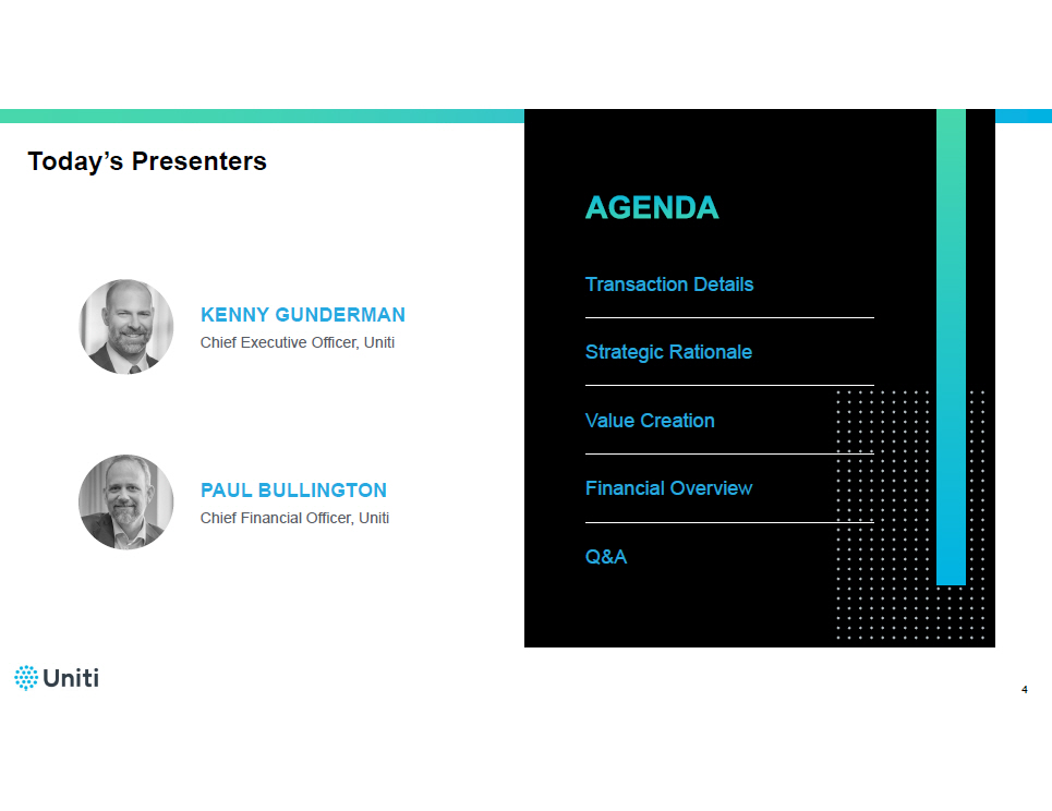 Cautionary Statement 3 Forward - Looking Statements This communication contains forward - looking statements, including within the meaning of the Private Securities Litigation Reform Act of 1995 . Forward - looking statements can often be identified by terms such as “may,” “will,” “appears,” “should,” “expects,” “plans,” “anticipates,” “could,” “intends,” “target,” “projects,” “contemplates,” “believes,” “estimates,” “predicts,” “potential,” or “continue,” or the negative of these words or other similar terms or expressions that concern expectations, strategy, plans, or intentions . However, the absence of these words or similar terms does not mean that a statement is not forward - looking . All forward - looking statements are based on information and estimates available to Uniti and Windstream at the time of this communication and are not guarantees of future performance . Examples of forward - looking statements in this communication (made at the date of this communication unless otherwise indicated) include, among others, statements regarding our merger with Windstream and the future performance of New Uniti (together with Windstream and Uniti, the “Merged Group”), the perceived and potential synergies and other benefits of the Transaction, and expectations around the financial impact of the Transaction on the Merged Group’s financials . In addition, this communication contains statements concerning the intentions, beliefs and expectations, plans, strategies and objectives of the directors and management of Uniti and Windstream for Uniti and Windstream, respectively, and the Merged Group, the anticipated timing for and outcome and effects of the Transaction (including expected benefits to shareholders of Uniti), expectations for the ongoing development and growth potential of the Merged Group and the future operation of Uniti, Windstream and the Merged Group . These statements involve known and unknown risks, uncertainties and other factors that may cause actual results to be materially different from any results, levels of activity, performance or achievements expressed or implied by any forward - looking statement and may include statements regarding the expected timing and structure of the Transaction ; the ability of the parties to complete the Transaction considering the various closing conditions ; the expected benefits of the Transaction, such as improved operations, enhanced revenues and cash flow, synergies, growth potential, market profile, business plans, expanded portfolio and financial strength ; the competitive ability and position of New Uniti following completion of the Transaction ; and anticipated growth strategies and anticipated trends in Uniti’s, Windstream’s and, following the expected completion of the Transaction, New Uniti’s business . In addition, other factors related to the Transaction that contribute to the uncertain nature of the forward - looking statements and that could cause actual results and financial condition to differ materially from those expressed or implied include, but are not limited to : the satisfaction of the conditions precedent to the consummation of the Transaction, including, without limitation, the receipt of shareholder and regulatory approvals on the terms desired or anticipated ; unanticipated difficulties or expenditures relating to the Transaction, including, without limitation, difficulties that result in the failure to realize expected synergies, efficiencies and cost savings from the Transaction within the expected time period (if at all) ; potential difficulties in Uniti’s and Windstream’s ability to retain employees as a result of the announcement and pendency of the Transaction ; risks relating to the value of New Uniti’s securities to be issued in the Transaction ; disruptions of Uniti’s and Windstream’s current plans, operations and relationships with customers caused by the announcement and pendency of the Transaction ; legal proceedings that may be instituted against Uniti or Windstream following announcement of the Transaction ; funding requirements ; regulatory restrictions (including changes in regulatory restrictions or regulatory policy) and risks associated with general economic conditions . Additional factors that could cause actual results, level of activity, performance or achievements to differ materially from the results, level of activity, performance or achievements expressed or implied by the forward - looking statements are detailed in the filings with the SEC, including Uniti’s annual report on Form 10 - K, periodic quarterly reports on Form 10 - Q, periodic current reports on Form 8 - K and other documents filed with the SEC . There can be no assurance that the Transaction will be implemented or that plans of the respective directors and management of Uniti and Windstream for the Merged Group will proceed as currently expected or will ultimately be successful . Investors are strongly cautioned not to place undue reliance on forward - looking statements, including in respect of the financial or operating outlook for Uniti, Windstream or the Merged Group (including the realization of any expected synergies) . Except as required by applicable law, Uniti does not assume any obligation to, and expressly disclaims any duty to, provide any additional or updated information or to update any forward - looking statements, whether as a result of new information, future events or results, or otherwise . Nothing in this communication will, under any circumstances (including by reason of this communication remaining available and not being superseded or replaced by any other presentation or publication with respect to Uniti, Windstream or the Merged Group, or the subject matter of this communication), create an implication that there has been no change in the affairs of Uniti or Windstream since the date of this communicatio
