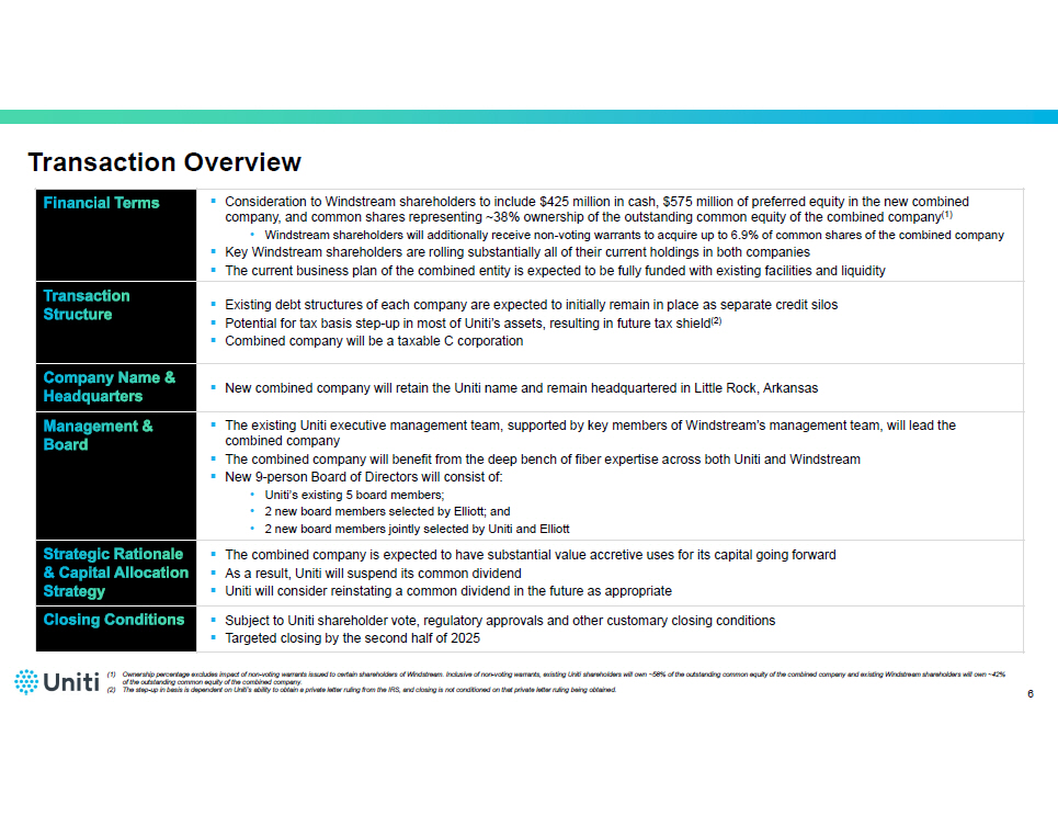 Transformative Combination Unlocks Significant Value 5 Uniti and Windstream to combine to create a premier insurgent fiber provider with ~$4 billion in revenue and 217,000 fiber route miles covering 47 states within the U.S. Existing Uniti shareholders will own ~62% and existing Windstream shareholders will own ~38% of the outstanding common equity of the combined company (1) , with certain of Windstream’s largest shareholders, including Elliott, rolling substantially all of their investment value in Windstream into the combined company New combined company will be well - positioned in rapidly growing market for digital infrastructure services, particularly in Tier II and III markets Combination accelerates growth, improves competitiveness and removes several dis - synergies and encumbrances, with additional levers for value creation and increased strategic optionality Compelling financial profile with meaningful synergies, enhanced cash flow generation and improved leverage that supports increasing shareholder returns (1) Ownership percentage excludes impact of non - voting warrants issued to certain shareholders of Windstream. Inclusive of non - votin g warrants, existing Uniti shareholders will own ~58% of the outstanding common equity of the combined company and existing W ind stream shareholders will own ~42% of the outstanding common equity of the combined company.