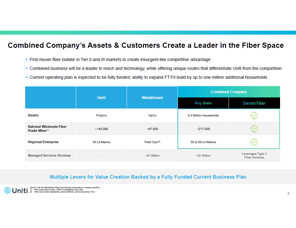 ▪ Consideration to Windstream shareholders to include $425 million in cash, $575 million of preferred equity in the new combine d company, and common shares representing ~38% ownership of the outstanding common equity of the combined company (1) • Windstream shareholders will additionally receive non - voting warrants to acquire up to 6.9% of common shares of the combined com pany ▪ Key Windstream shareholders are rolling substantially all of their current holdings in both companies ▪ The current business plan of the combined entity is expected to be fully funded with existing facilities and liquidity ▪ Existing debt structures of each company are expected to initially remain in place as separate credit silos ▪ Potential for tax basis step - up in most of Uniti’s assets, resulting in future tax shield (2) ▪ Combined company will be a taxable C corporation ▪ New combined company will retain the Uniti name and remain headquartered in Little Rock, Arkansas ▪ The existing Uniti executive management team, supported by key members of Windstream’s management team, will lead the combined company ▪ The combined company will benefit from the deep bench of fiber expertise across both Uniti and Windstream ▪ New 9 - person Board of Directors will consist of: • Uniti’s existing 5 board members; • 2 new board members selected by Elliott; and • 2 new board members jointly selected by Uniti and Elliott ▪ The combined company is expected to have substantial value accretive uses for its capital going forward ▪ As a result, Uniti will suspend its common dividend ▪ Uniti will consider reinstating a common dividend in the future as appropriate ▪ Subject to Uniti shareholder vote, regulatory approvals and other customary closing conditions ▪ Targeted closing by the second half of 2025 Transaction Overview 6 (1) Ownership percentage excludes impact of non - voting warrants issued to certain shareholders of Windstream. Inclusive of non - votin g warrants, existing Uniti shareholders will own ~58% of the outstanding common equity of the combined company and existing W ind stream shareholders will own ~42% of the outstanding common equity of the combined company. (2) The step - up in basis is dependent on Uniti’s ability to obtain a private letter ruling from the IRS, and closing is not conditio ned on that private letter ruling being obtained.