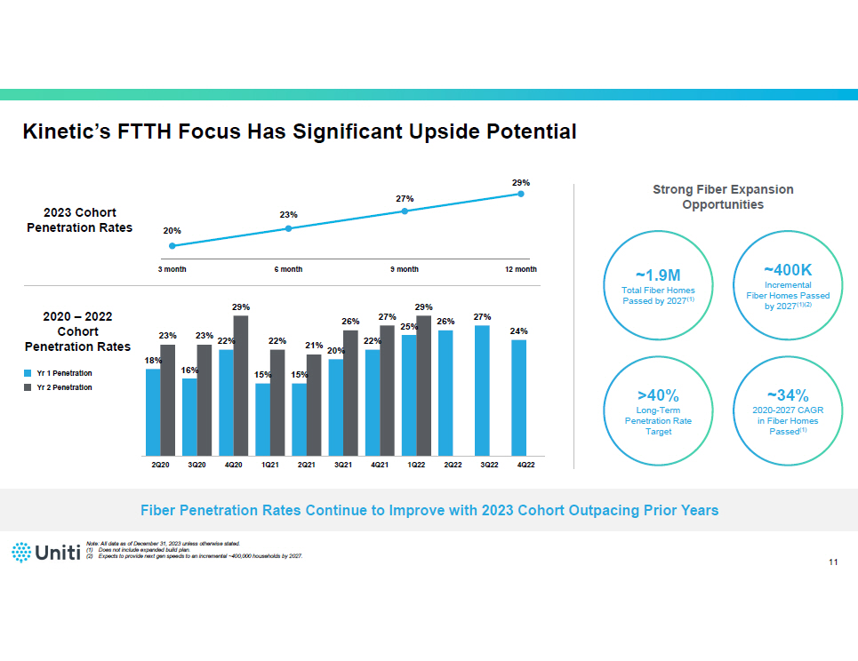 Unique, diverse footprint with limited overbuilder presence ▪ Rural and geographically diverse footprint: ~75% of footprint in markets with less than 20,000 households ▪ Insurgent fiber provider resulting in 85% of footprint with no overbuilders Additional network investments enhance competitive advantage and lower capex for FTTH upgrades ▪ Fiber and transport network investments over past 10 years support industry - leading ~$ 650 cost per passing Already upgraded ~1.5 million households to Next - gen FTTH ▪ Committed to fiber expansion in Tier II/III markets ▪ Secured grants/awards to build fiber to over 300,000 households in upcoming years through RDOF and public p rivate p artnerships Proven build capabilities with strategic differentiation of in - sourced construction team ▪ Construction and engineering team consisting of ~1,000 employees ▪ Capable of managing significant build velocity with steadfast commitment to delivering high - quality results Kinetic Investment Highlights 10