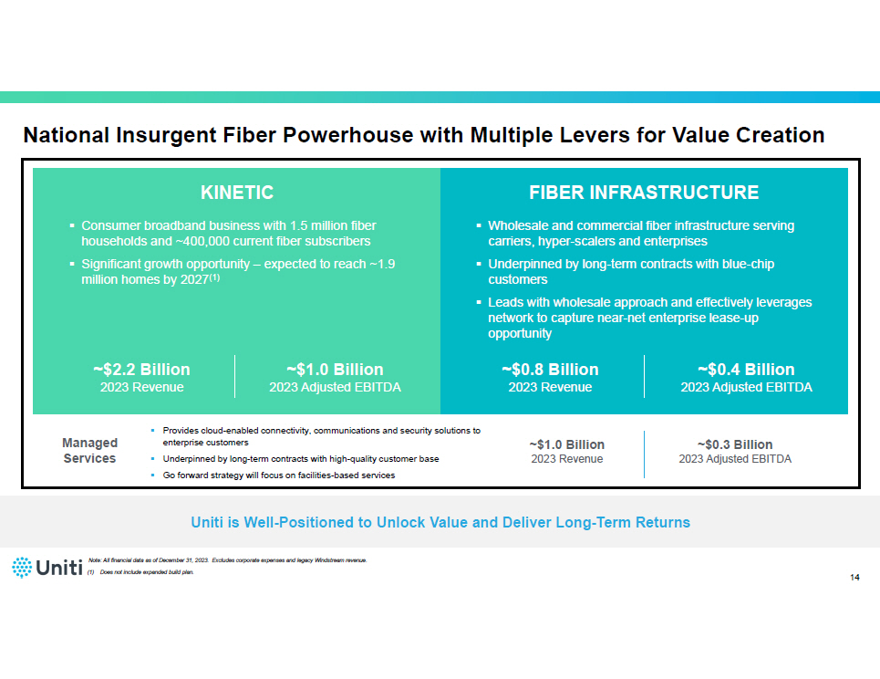 Hyperscalers and Gen AI Help Fuel National Growth Opportunity 12 $1.9 $2.1 $2.4 $2.7 $2.9 $3.2 $3.5 $3.7 $4.0 2022E 2023E 2024E 2025E 2026E 2027E 2028E 2029E 2030E $1.4 $1.5 $1.6 $1.8 $1.9 $2.1 $2.2 $2.4 $2.6 2022A 2023E 2024E 2025E 2026E 2027E 2028E 2029E 2030E ▪ Recent industry trends have created a significant opportunity to establish a new lit transport network without legacy encumbrances • Current Uniti has been selectively lighting routes with a multi - year plan • The combination with Windstream Wholesale is expected to accelerate the plan by ~4 years • Strong growth opportunity fueled by significant macro tailwinds, including Generative AI • Combined company will have many distinct Tier II and III intercity routes with same favorable competitive dynamics as in our current metro markets North American Dark Fiber Demand ($ in Billions) (2) North America Total Waves Spend ($in Billions) (1) (1) Source: ReportLinker. (2) Source: Grand View Research. Represents expected dark fiber annual revenue within North America. Annual Growth rate based on ex pected constant annual growth rate from 2022 to 2030. Available Phase 1 – 2024 - 2025 Phase 2 – 2025 Phase 3 – 2026 Phase 4 – >2026 Uniti’s Current Lit Transport Timeline