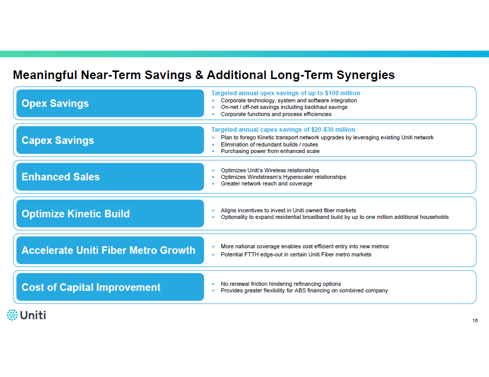 Strong Financial Profile 15 2023 Combined 2023 Windstream 2023 Uniti ($ in Billions ) $4.4 $4.0 $1.1 Revenue (1) $1.7 $0.9 $0.9 Adjusted EBITDA (2)(3) $1.2 $1.0 $0.2 Net Capital Expenditures (4) $0.5 ($0.1) $0.8 Free Cash Flow (5) $8.0 $2.4 $5.6 Total Debt (6) $0.8 $0.4 $0.4 Liquidity (6)(7) 4.8x 2.6x 6.0x Adjusted Net Leverage (7)(8) De - levered Balance S heet with Sufficient C ash F lows and Liquidity to Self - Fund Current FTTH Build P lan Note: All data as of December 31, 2023. Adjustments noted below were not prepared in accordance with Regulation S - X. Actual pro forma information prepared in accordance with Regulation S - X may differ materially from the information presented above. (1) Uniti revenue excludes $4 million of revenue related to recent asset sales. Combined revenue excludes $774 million of revenu e r elated to the master lease agreements. (2) Uniti Adjusted EBITDA excludes $9 million of Adjusted EBITDA related to r ecent asset sales. Combined Adjusted EBITDA excludes $70 million of non - cash items related to the master lease agreements, $130 million of GCI and Windstream settlement payments , and includes $100 million of estimated cost synergies. (3) See Appendix for a reconciliation of Adjusted EBITDA to Net Income, the most closely comparable GAAP metric. (4) Uniti Net Capital Expenditures excludes GCI - related capex, which is included in Windstream net capex. (5) Calculated as Adjusted EBITDA minus Capital Expenditures. (6) Excludes any potential capital markets activity and related impact to cash balance to fund the $425 million cash payment to h old ers of Windstream. (7) Includes $87 million of proceeds from recent asset sales at Uniti. (8) Combined Adjusted Net Leverage gives effect for the $425 million cash payment to holders of Windstream.