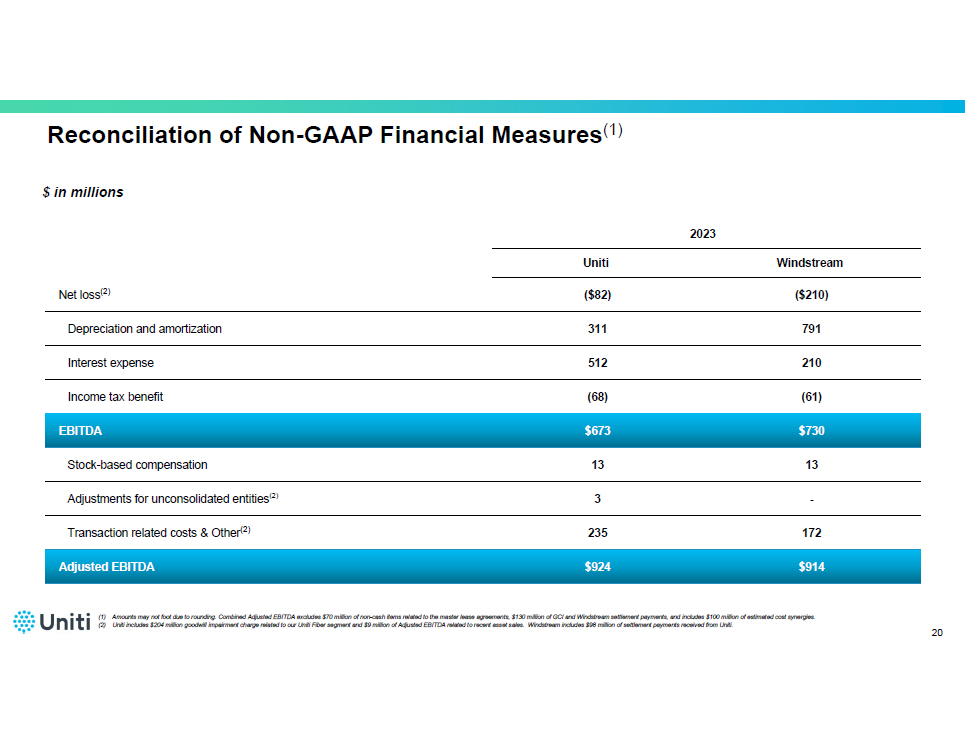 Reconciliation of Non - GAAP Financial Measures (1) $ in millions 2023 Windstream Uniti ($210) ($82) Net loss (2) 791 311 Depreciation and amortization 210 512 Interest expense (61) (68) Income tax benefit $730 $673 EBITDA 13 13 Stock - based compensation - 3 Adjustments for unconsolidated entities (2) 172 235 Transaction related costs & Other (2) $914 $924 Adjusted EBITDA (1) Amounts may not foot due to rounding. Combined Adjusted EBITDA excludes $70 million of non - cash items related to the master lease agreements, $130 million of GCI and Windstream settlement payments , and includes $100 million of estimated cost synergies. (2) Uniti includes $204 million goodwill impairment charge related to our Uniti Fiber segment and $9 million of Adjusted EBITDA r ela ted to recent asset sales. Windstream includes $98 million of settlement payments received from Uniti. 20