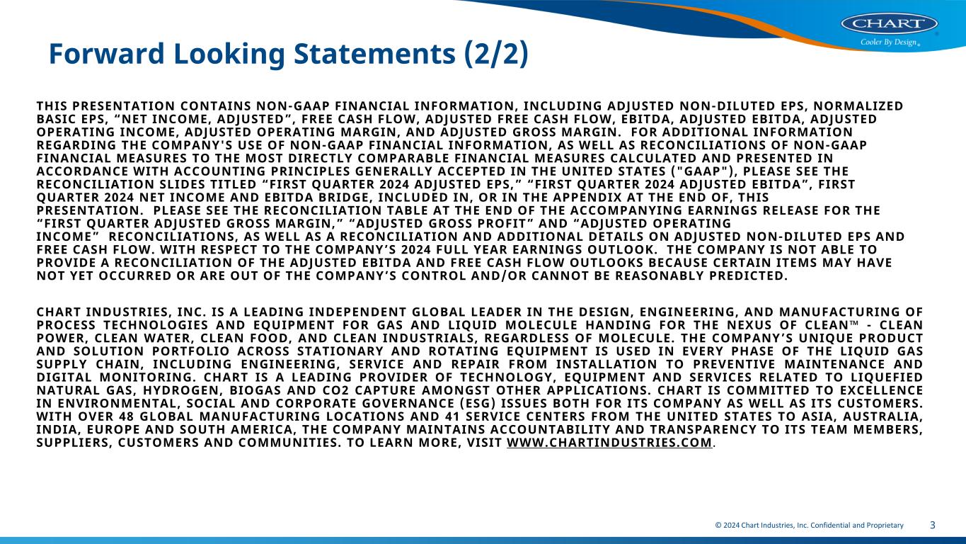 © 2024 Chart Industries, Inc. Confidential and Proprietary 2 Forward Looking Statements (1/2) CERTAIN STATEMENTS MADE IN THIS INVESTOR PRESENTATION ARE FORWARD-LOOKING STATEMENTS WITHIN THE MEANING OF THE PRIVATE SECURITIES LITIGATION REFORM ACT OF 1995. FORWARD-LOOKING STATEMENTS INCLUDE STATEMENTS CONCERNING CHART’S BUSINESS PLANS, INCLUDING STATEMENTS REGARDING OBJECTIVES, FUTURE ORDERS, REVENUES, MARGINS, EARNINGS, PERFORMANCE OR OUTLOOK, BUSINESS OR INDUSTRY TRENDS AND OTHER INFORMATION THAT IS NOT HISTORICAL IN NATURE. FORWARD-LOOKING STATEMENTS MAY BE IDENTIFIED BY TERMINOLOGY SUCH AS “MAY,” “WILL,” “SHOULD,” “COULD,” “EXPECTS,” “ANTICIPATES,” “BELIEVES,” “PROJECTS,” “FORECASTS,” “INDICATORS”, “OUTLOOK,” “GUIDANCE,” “CONTINUE,” “TARGET,” OR THE NEGATIVE OF SUCH TERMS OR COMPARABLE TERMINOLOGY. FORWARD-LOOKING STATEMENTS CONTAINED IN THIS PRESENTATION OR IN OTHER STATEMENTS MADE BY CHART ARE MADE BASED ON MANAGEMENT’S EXPECTATIONS AND BELIEFS CONCERNING FUTURE EVENTS IMPACTING CHART AND ARE SUBJECT TO UNCERTAINTIES AND FACTORS RELATING TO CHART’S OPERATIONS AND BUSINESS ENVIRONMENT, ALL OF WHICH ARE DIFFICULT TO PREDICT AND MANY OF WHICH ARE BEYOND CHART’S CONTROL, THAT COULD CAUSE CHART’S ACTUAL RESULTS TO DIFFER MATERIALLY FROM THOSE MATTERS EXPRESSED OR IMPLIED BY FORWARD-LOOKING STATEMENTS. FACTORS THAT COULD CAUSE CHART’S ACTUAL RESULTS TO DIFFER MATERIALLY FROM THOSE DESCRIBED IN THE FORWARD-LOOKING STATEMENTS INCLUDE: CHART MAY BE UNABLE TO ACHIEVE THE ANTICIPATED BENEFITS OF RECENT ACQUISITIONS, INCLUDING THE ACQUISITION OF HOWDEN (THE “ACQUISITION”) (INCLUDING WITH RESPECT TO ESTIMATED FUTURE COST AND COMMERCIAL SYNERGIES); REVENUES FOLLOWING THE ACQUISITION MAY BE LOWER THAN EXPECTED; OPERATING COSTS, CUSTOMER LOSSES, AND BUSINESS DISRUPTION (INCLUDING, WITHOUT LIMITATION, DIFFICULTIES IN MAINTAINING RELATIONSHIPS WITH EMPLOYEES, CUSTOMERS AND SUPPLIERS) RESULTING FROM THE ACQUISITION MAY BE GREATER THAN EXPECTED; SLOWER THAN ANTICIPATED GROWTH AND MARKET ACCEPTANCE OF NEW CLEAN ENERGY PRODUCT OFFERINGS; INABILITY TO ACHIEVE EXPECTED PRICING INCREASES OR CONTINUED SUPPLY CHAIN CHALLENGES INCLUDING VOLATILITY IN RAW MATERIALS AND SUPPLY; RISKS RELATING TO REGIONAL CONFLICTS AND UNREST, INCLUDING THE RECENT UNREST IN THE MIDDLE EAST AND THE CONFLICT BETWEEN RUSSIA AND UKRAINE, INCLUDING POTENTIAL ENERGY SHORTAGES IN EUROPE AND ELSEWHERE AND THE OTHER FACTORS DISCUSSED IN ITEM 1A (RISK FACTORS) IN CHART’S MOST RECENT ANNUAL REPORT ON FORM 10-K FILED WITH THE SEC, WHICH SHOULD BE REVIEWED CAREFULLY. CHART UNDERTAKES NO OBLIGATION TO UPDATE OR REVISE ANY FORWARD- LOOKING STATEMENT.