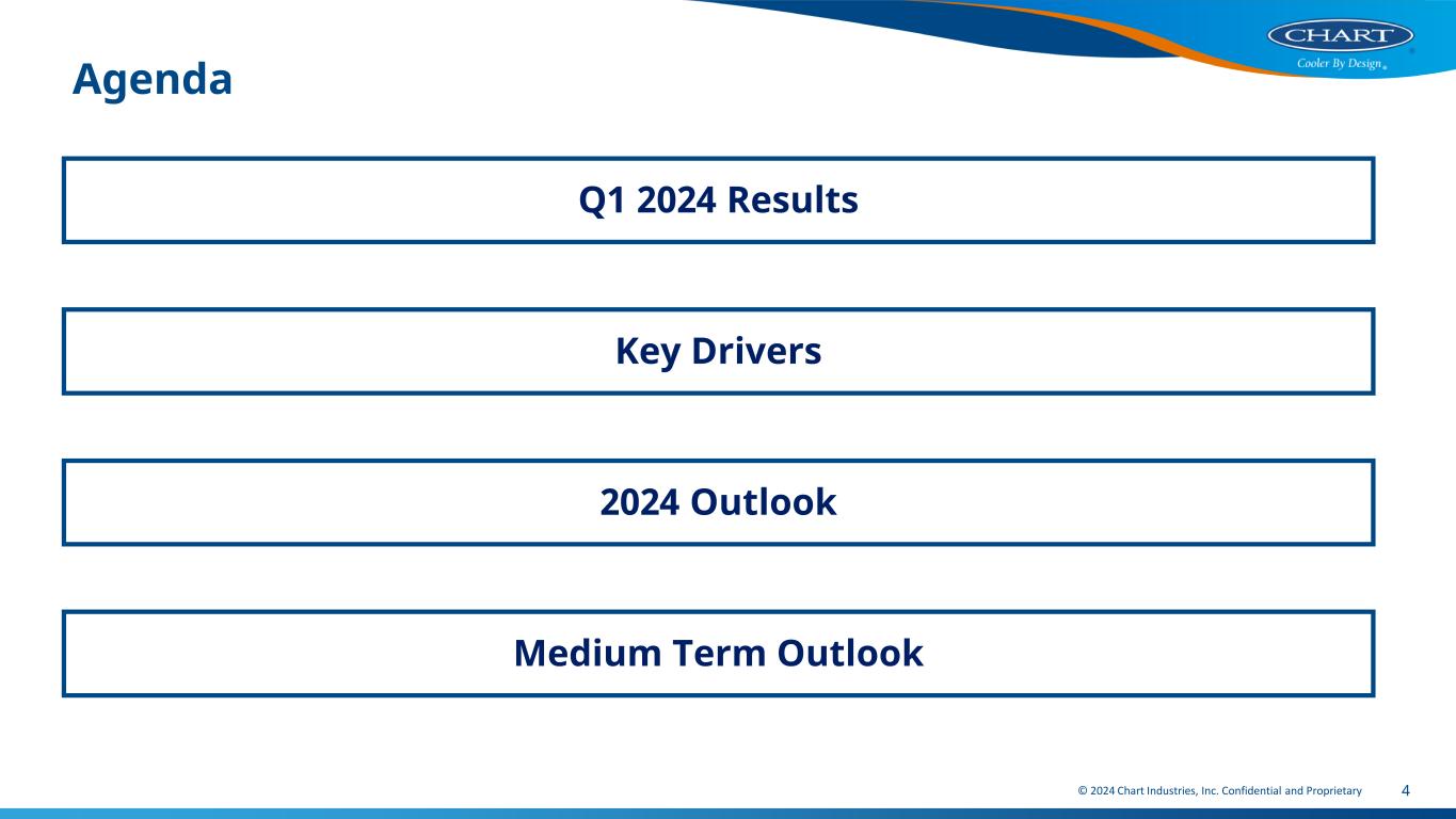 © 2024 Chart Industries, Inc. Confidential and Proprietary 3 Forward Looking Statements (2/2) THIS PRESENTATION CONTAINS NON-GAAP FINANCIAL INFORMATION, INCLUDING ADJUSTED NON-DILUTED EPS, NORMALIZED BASIC EPS, “NET INCOME, ADJUSTED”, FREE CASH FLOW, ADJUSTED FREE CASH FLOW, EBITDA, ADJUSTED EBITDA, ADJUSTED OPERATING INCOME, ADJUSTED OPERATING MARGIN, AND ADJUSTED GROSS MARGIN. FOR ADDITIONAL INFORMATION REGARDING THE COMPANY'S USE OF NON-GAAP FINANCIAL INFORMATION, AS WELL AS RECONCILIATIONS OF NON-GAAP FINANCIAL MEASURES TO THE MOST DIRECTLY COMPARABLE FINANCIAL MEASURES CALCULATED AND PRESENTED IN ACCORDANCE WITH ACCOUNTING PRINCIPLES GENERALLY ACCEPTED IN THE UNITED STATES ("GAAP"), PLEASE SEE THE RECONCILIATION SLIDES TITLED “FIRST QUARTER 2024 ADJUSTED EPS,” “FIRST QUARTER 2024 ADJUSTED EBITDA”, FIRST QUARTER 2024 NET INCOME AND EBITDA BRIDGE, INCLUDED IN, OR IN THE APPENDIX AT THE END OF, THIS PRESENTATION. PLEASE SEE THE RECONCILIATION TABLE AT THE END OF THE ACCOMPANYING EARNINGS RELEASE FOR THE “FIRST QUARTER ADJUSTED GROSS MARGIN,” “ADJUSTED GROSS PROFIT” AND “ADJUSTED OPERATING INCOME” RECONCILIATIONS, AS WELL AS A RECONCILIATION AND ADDITIONAL DETAILS ON ADJUSTED NON-DILUTED EPS AND FREE CASH FLOW. WITH RESPECT TO THE COMPANY’S 2024 FULL YEAR EARNINGS OUTLOOK. THE COMPANY IS NOT ABLE TO PROVIDE A RECONCILIATION OF THE ADJUSTED EBITDA AND FREE CASH FLOW OUTLOOKS BECAUSE CERTAIN ITEMS MAY HAVE NOT YET OCCURRED OR ARE OUT OF THE COMPANY’S CONTROL AND/OR CANNOT BE REASONABLY PREDICTED. CHART INDUSTRIES, INC. IS A LEADING INDEPENDENT GLOBAL LEADER IN THE DESIGN, ENGINEERING, AND MANUFACTURING OF PROCESS TECHNOLOGIES AND EQUIPMENT FOR GAS AND LIQUID MOLECULE HANDING FOR THE NEXUS OF CLEAN - CLEAN POWER, CLEAN WATER, CLEAN FOOD, AND CLEAN INDUSTRIALS, REGARDLESS OF MOLECULE. THE COMPANY’S UNIQUE PRODUCT AND SOLUTION PORTFOLIO ACROSS STATIONARY AND ROTATING EQUIPMENT IS USED IN EVERY PHASE OF THE LIQUID GAS SUPPLY CHAIN, INCLUDING ENGINEERING, SERVICE AND REPAIR FROM INSTALLATION TO PREVENTIVE MAINTENANCE AND DIGITAL MONITORING. CHART IS A LEADING PROVIDER OF TECHNOLOGY, EQUIPMENT AND SERVICES RELATED TO LIQUEFIED NATURAL GAS, HYDROGEN, BIOGAS AND CO2 CAPTURE AMONGST OTHER APPLICATIONS. CHART IS COMMITTED TO EXCELLENCE IN ENVIRONMENTAL, SOCIAL AND CORPORATE GOVERNANCE (ESG) ISSUES BOTH FOR ITS COMPANY AS WELL AS ITS CUSTOMERS. WITH OVER 48 GLOBAL MANUFACTURING LOCATIONS AND 41 SERVICE CENTERS FROM THE UNITED STATES TO ASIA, AUSTRALIA, INDIA, EUROPE AND SOUTH AMERICA, THE COMPANY MAINTAINS ACCOUNTABILITY AND TRANSPARENCY TO ITS TEAM MEMBERS, SUPPLIERS, CUSTOMERS AND COMMUNITIES. TO LEARN MORE, VISIT WWW.CHARTINDUSTRIES.COM.