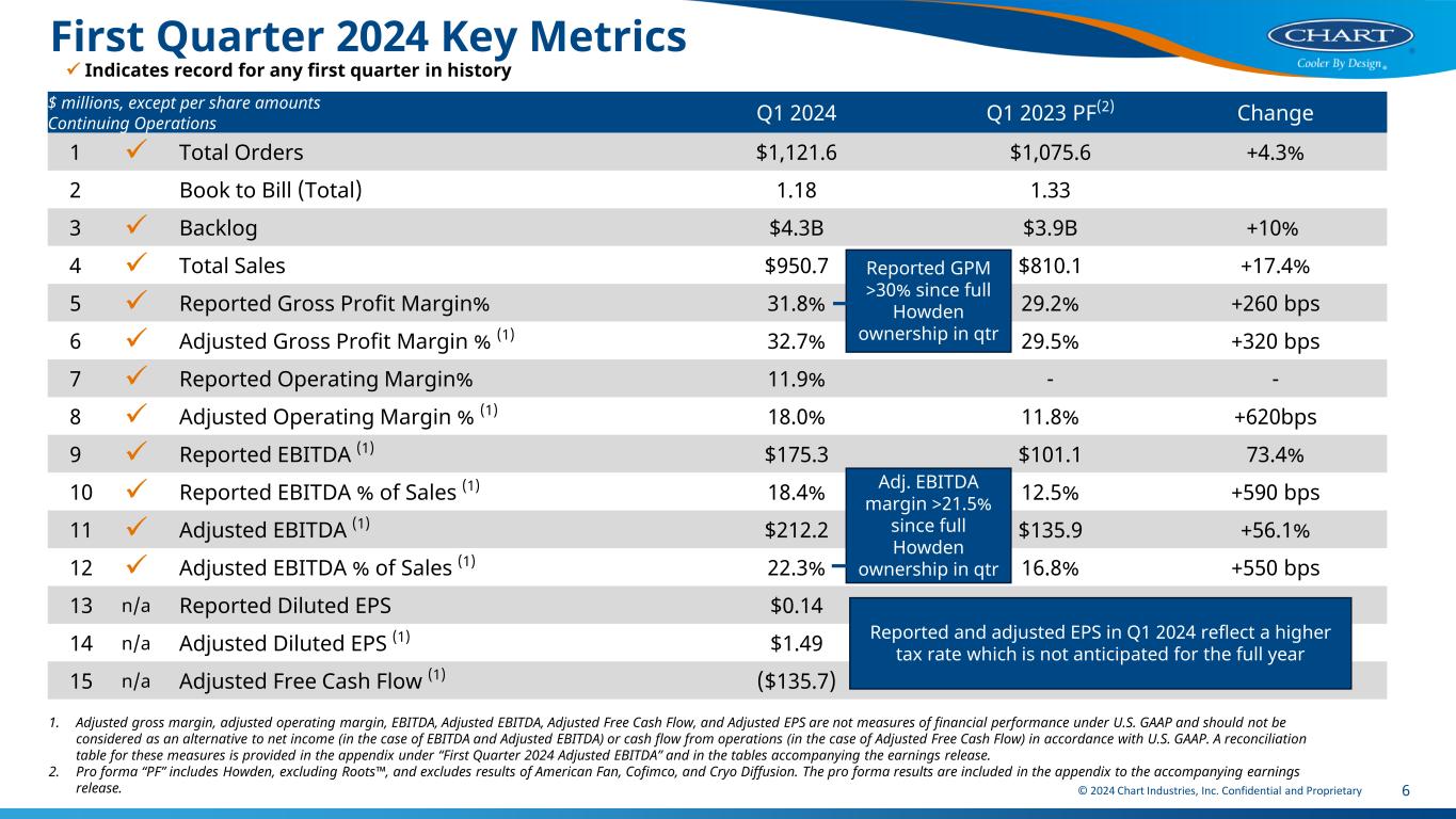 © 2024 Chart Industries, Inc. Confidential and Proprietary 5 First Quarter 2024 Key Messages All metrics are on a pro forma combined continuing operations basis (1) Achieved multiple first quarter financial record results • Orders, backlog, sales, reported and adjusted gross margin, reported and adjusted operating margin, reported and adjusted EBITDA and associated EBITDA margin were all the highest in any first quarter in our history • Pro forma organic orders and sales growth of 4.9% and 18.3% year-over-year, respectively • Reported gross margin of 31.8%, a 260 basis point increase compared to the first quarter 2023, and continued consistency of gross margin above 30% each quarter since we closed on the acquisition of Howden • Adjusted operating income of $171.3 million, or 18.0%, contributing to adjusted EBITDA of $212.2 million, or 22.3% Demand remains robust across end markets • Record backlog of $4.3 billion is up 10% compared to first quarter 2023 • Orders have been above $1 billion each of the past six quarters • Consistently above 1.0 on book-to-bill each quarter, with Q1 2024 book-to-bill of 1.18 • Global hydrogen demand broadening, with a liquefaction win (USA), our first hydrogen project in Portugal (compression), our largest compressor order ever for a green industrial application (EU), and a new partnership with GasLog for large-scale hydrogen for marine/logistics applications • LNG orders continue, including content on Cedar LNG, Q1 orders for LNG trailers in China were more than 2X total orders for entire 2022 or 2023, and highest HLNG vehicle tank order quarter since 2021 (over $10 million in Q1’24) Q1 2024 net leverage ratio of 3.43X reflects cash seasonality; on track to target net leverage ratio of 2.0 to 2.5X • Reiterate financial policy and target net leverage ratio of 2.0X to 2.5X 2024 financial guidance is reiterated 1. Pro forma “PF” includes full year Howden, excluding Roots , American Fan, Cofimco, and Cryo Diffusion. The pro forma results are included in the appendix to the accompanying earnings release.