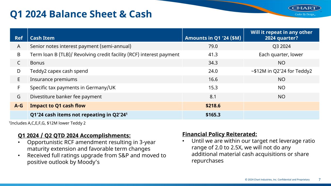 © 2024 Chart Industries, Inc. Confidential and Proprietary 6 First Quarter 2024 Key Metrics $ millions, except per share amounts Q1 2024 Q1 2023 PF(2) ChangeContinuing Operations 1 Total Orders $1,121.6 $1,075.6 +4.3% 2 Book to Bill (Total) 1.18 1.33 3 Backlog $4.3B $3.9B +10% 4 Total Sales $950.7 $810.1 +17.4% 5 Reported Gross Profit Margin% 31.8% 29.2% +260 bps 6 Adjusted Gross Profit Margin % (1) 32.7% 29.5% +320 bps 7 Reported Operating Margin% 11.9% - - 8 Adjusted Operating Margin % (1) 18.0% 11.8% +620bps 9 Reported EBITDA (1) $175.3 $101.1 73.4% 10 Reported EBITDA % of Sales (1) 18.4% 12.5% +590 bps 11 Adjusted EBITDA (1) $212.2 $135.9 +56.1% 12 Adjusted EBITDA % of Sales (1) 22.3% 16.8% +550 bps 13 n/a Reported Diluted EPS $0.14 - - 14 n/a Adjusted Diluted EPS (1) $1.49 - - 15 n/a Adjusted Free Cash Flow (1) ($135.7) - - Indicates record for any first quarter in history 1. Adjusted gross margin, adjusted operating margin, EBITDA, Adjusted EBITDA, Adjusted Free Cash Flow, and Adjusted EPS are not measures of financial performance under U.S. GAAP and should not be considered as an alternative to net income (in the case of EBITDA and Adjusted EBITDA) or cash flow from operations (in the case of Adjusted Free Cash Flow) in accordance with U.S. GAAP. A reconciliation table for these measures is provided in the appendix under “First Quarter 2024 Adjusted EBITDA” and in the tables accompanying the earnings release. 2. Pro forma “PF” includes Howden, excluding Roots , and excludes results of American Fan, Cofimco, and Cryo Diffusion. The pro forma results are included in the appendix to the accompanying earnings release. Reported and adjusted EPS in Q1 2024 reflect a higher tax rate which is not anticipated for the full year Reported GPM >30% since full Howden ownership in qtr Adj. EBITDA margin >21.5% since full Howden ownership in qtr