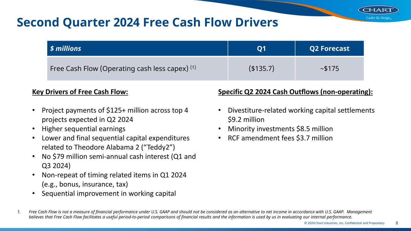 © 2024 Chart Industries, Inc. Confidential and Proprietary 7 Q1 2024 Balance Sheet & Cash Q1 2024 / Q2 QTD 2024 Accomplishments: • Opportunistic RCF amendment resulting in 3-year maturity extension and favorable term changes • Received full ratings upgrade from S&P and moved to positive outlook by Moody’s Ref Cash Item Amounts in Q1 ‘24 ($M) Will it repeat in any other 2024 quarter? A Senior notes interest payment (semi-annual) 79.0 Q3 2024 B Term loan B (TLB)/ Revolving credit facility (RCF) interest payment 41.3 Each quarter, lower C Bonus 34.3 NO D Teddy2 capex cash spend 24.0 ~$12M in Q2’24 for Teddy2 E Insurance premiums 16.6 NO F Specific tax payments in Germany/UK 15.3 NO G Divestiture banker fee payment 8.1 NO A-G Impact to Q1 cash flow $218.6 Q1’24 cash items not repeating in Q2’241 $165.3 1Includes A,C,E,F,G, $12M lower Teddy 2 Financial Policy Reiterated: • Until we are within our target net leverage ratio range of 2.0 to 2.5X, we will not do any additional material cash acquisitions or share repurchases