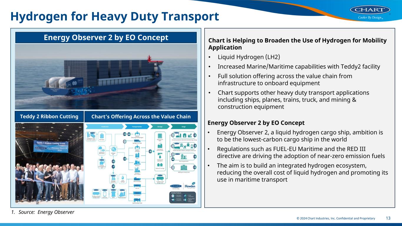 © 2024 Chart Industries, Inc. Confidential and Proprietary Broad Macro Tailwinds Positively Impacting Chart Industries 12 REF Macro Drivers (Not All Inclusive) Specific Tailwinds How Chart Plays A Global Energy Transition and Access • Energy security, energy access, and energy/grid stability • Demand for, and government support for decarbonization • Equipment and process technology for the production, distribution & storage and end use of a molecule (i.e., LNG, H2) • Efficient equipment and services enabling emissions reduction across multiple industrial processes (e.g., metals, cement) B Clean Water Scarcity • More stringent regulatory environment; i.e., U.S. EPA regulations (April 2024) • Africa, Middle East & Asia facing water scarcity, investment in treatment plants and desalination • Full solution water treatment offering across multiple containments including arsenic and PFAS. • Systems for environmental remediation • Compression • Systems for water remineralization C Artificial Intelligence, inclusive of data center, battery, energy intensity • Electrification • Growth in demand for global computing power • Customer demand for decarbonization • Efficiency and safety solution for mining of critical minerals and electrification metals • Backup power for data center • Full solution carbon capture offering from high to low capture purity D Population and Economic Growth Combined with Urbanization and Aging Infrastructure • Rising middle class • Global regulatory environment • Modernization requires a molecule economy • Decarbonization of mobility (e.g., rail, truck, marine) • Supply and demand side equipment and technology for the molecule economy