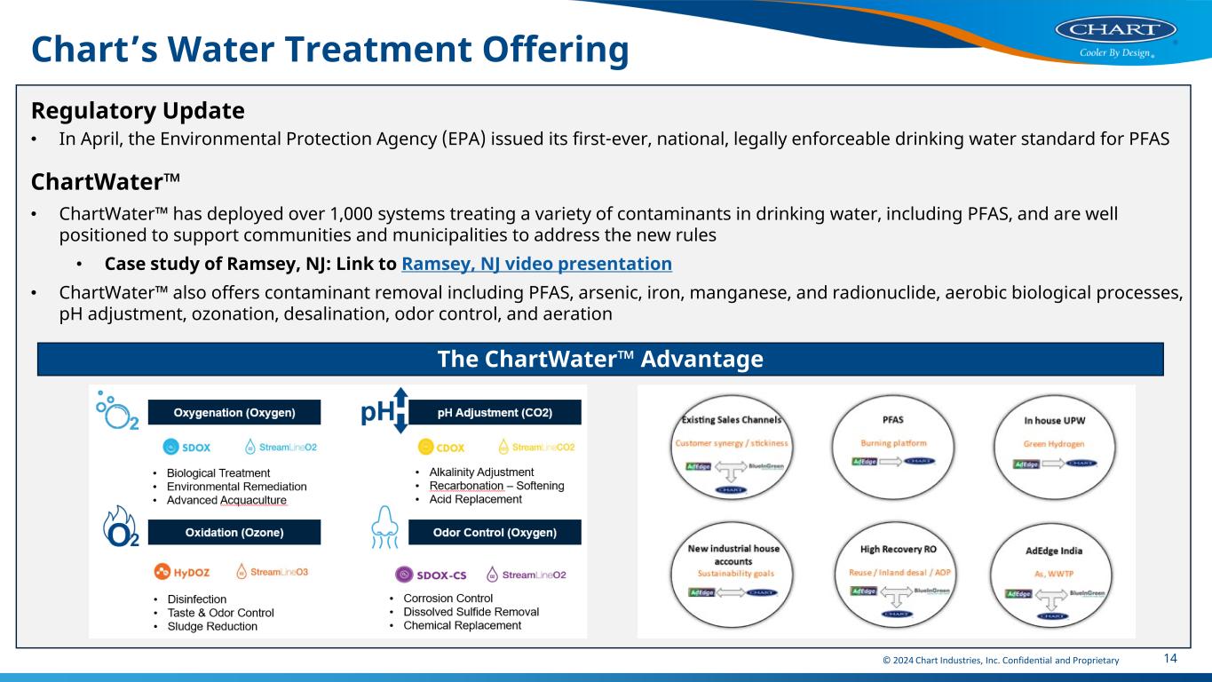 13 Hydrogen for Heavy Duty Transport 1. Source: Energy Observer Chart is Helping to Broaden the Use of Hydrogen for Mobility Application • Liquid Hydrogen (LH2) • Increased Marine/Maritime capabilities with Teddy2 facility • Full solution offering across the value chain from infrastructure to onboard equipment • Chart supports other heavy duty transport applications including ships, planes, trains, truck, and mining & construction equipment Energy Observer 2 by EO Concept Energy Observer 2 by EO Concept • Energy Observer 2, a liquid hydrogen cargo ship, ambition is to be the lowest-carbon cargo ship in the world • Regulations such as FUEL-EU Maritime and the RED III directive are driving the adoption of near-zero emission fuels • The aim is to build an integrated hydrogen ecosystem, reducing the overall cost of liquid hydrogen and promoting its use in maritime transport Teddy 2 Ribbon Cutting Chart’s Offering Across the Value Chain © 2024 Chart Industries, Inc. Confidential and Proprietary