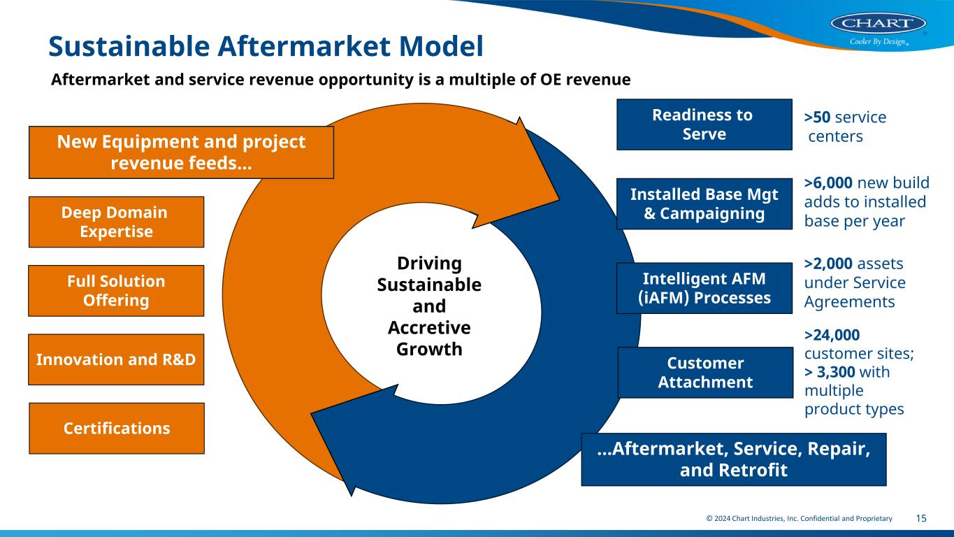 14 Chart’s Water Treatment Offering Regulatory Update • In April, the Environmental Protection Agency (EPA) issued its first-ever, national, legally enforceable drinking water standard for PFAS ChartWater • ChartWater has deployed over 1,000 systems treating a variety of contaminants in drinking water, including PFAS, and are well positioned to support communities and municipalities to address the new rules • Case study of Ramsey, NJ: Link to Ramsey, NJ video presentation • ChartWater also offers contaminant removal including PFAS, arsenic, iron, manganese, and radionuclide, aerobic biological processes, pH adjustment, ozonation, desalination, odor control, and aeration The ChartWater Advantage © 2024 Chart Industries, Inc. Confidential and Proprietary