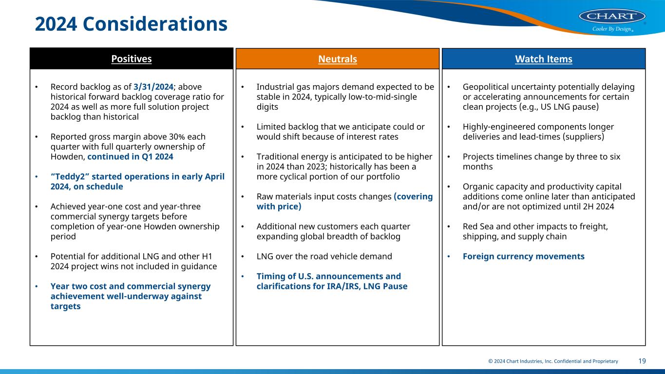 © 2024 Chart Industries, Inc. Confidential and Proprietary Chart Industries 2024 Outlook 18 Guidance Metrics as of May 3, 2024 1. EBITDA, Adjusted EBITDA, and Free Cash Flow are not measures of financial performance under U.S. GAAP and should not be considered as an alternative to net income in accordance with U.S. GAAP (as is the case with EBITDA and adjusted EBITDA) and cashflows from operations in accordance with U.S. GAAP (as is the case with free cash flow). Management believes that EBITDA, Adjusted EBITDA, and Free Cash Flow facilitate useful period-to-period comparisons of financial results and the information is used by us in evaluating our internal performance. 2. Adjusted diluted EPS is a non-GAAP measure and should not be considered as an alternative to diluted EPS in accordance with U.S. GAAP. Guidance Comments Revenue $4.7B to $5.0B • Total sales revenue growth of 32% to 40% vs. pro forma 2023 • FX impact estimated to be approximately flat vs pro forma 2023 • 63% of YE23 backlog is expected to ship in 2024 Adjusted EBITDA(1) $1.175B to $1.30B • Benefits from volume leverage • Benefit from cost synergies • Benefits from higher full solutions mix Free Cash Flow(1) $575M to $625M • Capital expenditures $115 million to $125 million • FCF to adjusted net income conversion ratio of 95% to 100% Adjusted Earnings per Share(2) $12.00 to $14.00 • Excludes the full year impact of Howden depreciation & amortization related to acquired intangibles and PPE step-up • Effective tax rate of approximately 20% • Diluted share count of 47 million to 48 million