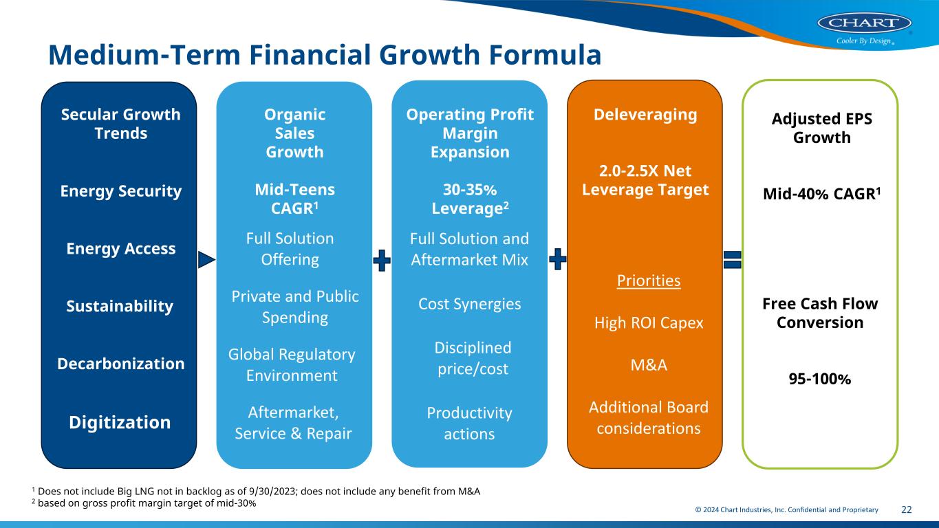 © 2024 Chart Industries, Inc. Confidential and Proprietary 21 Return on Invested Capital 3-Year Average 2024 Forecast Medium-Term Target • Step up in Chart’s Return on Invested Capital (ROIC) Driven by: • Shift to lower capital Aftermarket business • Capital expenditures representing 2.0-2.5% of revenue • Higher mix of full solution revenue • Continued focus on ROIC as it is a component of the company’s Long-Term Incentive (LTI) program • Achievement of targeted 2.0-2.5X net leverage ratio • Synergy realization Low- Teens 1. ROIC = Adjusted net operating profit * (1- tax rate) / (total debt + total equity) Mid- Teens 7.6%