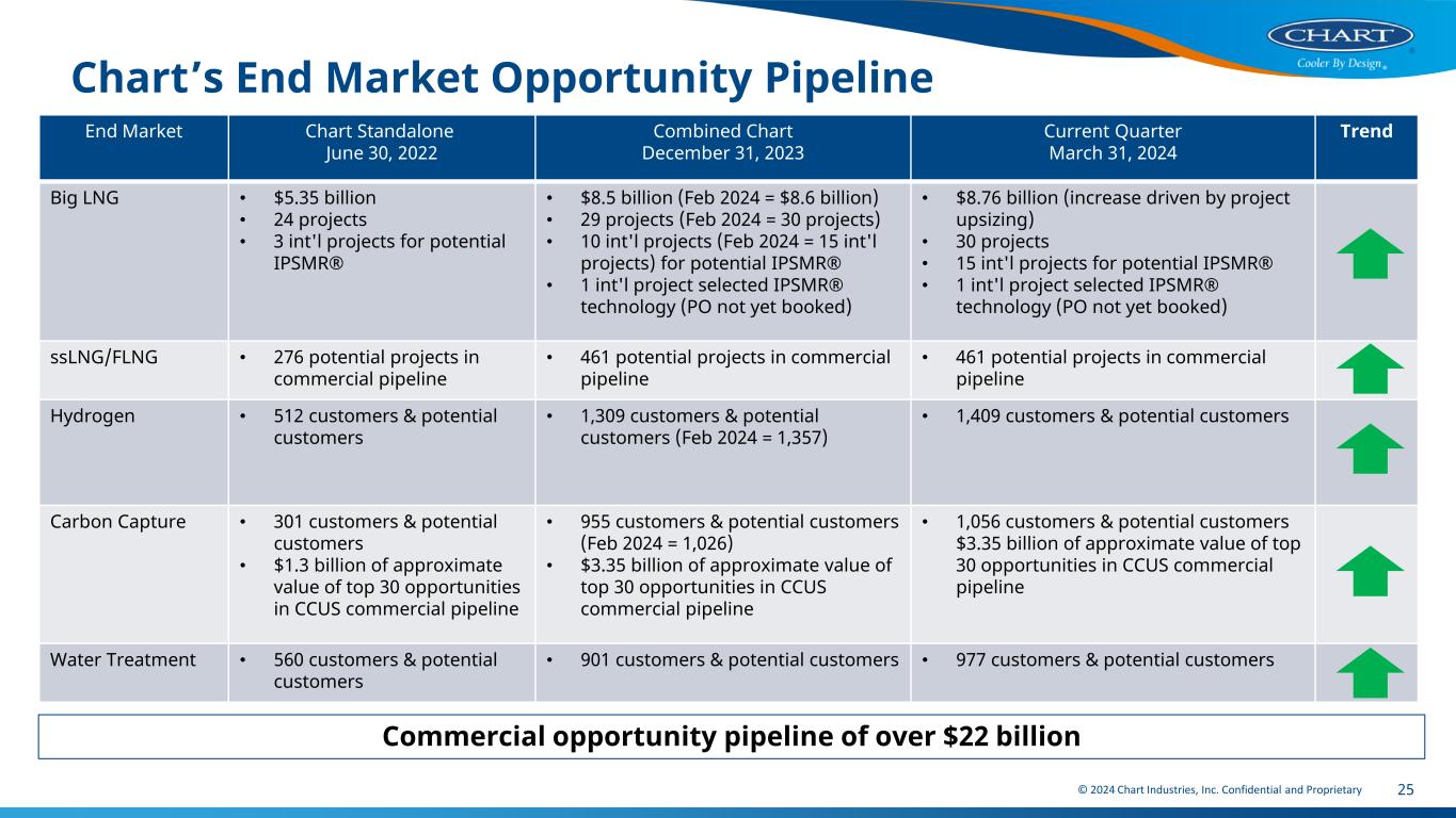 © 2024 Chart Industries, Inc. Confidential and Proprietary 24 Full Year 2024 Key Assumptions for Frameworks Interest Expense and Deferred Financing Fees ~$315 million Tax rate ~20% Depreciation & Amortization (“D&A”) ~$270 million Adjusted Depreciation & Amortization(1) ~$110 million Stock compensation expense ~$18 million Non-controlling interest ~$12 million Diluted share count 47 million to 48 million 1. Adjusted Depreciation & Amortization excludes Howden D&A related to acquired intangibles and PPE step-up.