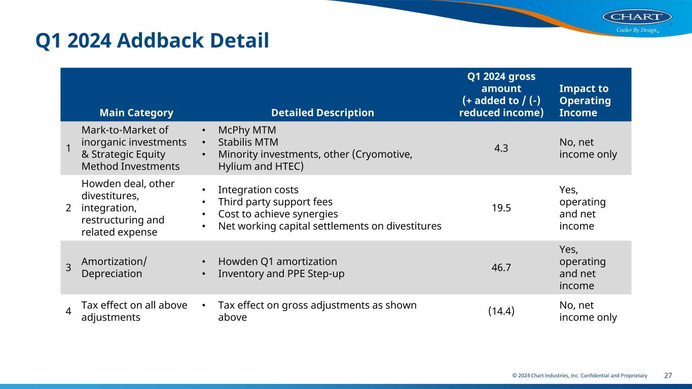 © 2024 Chart Industries, Inc. Confidential and Proprietary 26 First Quarter 2024 Net Income & EBITDA Bridge $ millions, except per share amounts Q1 2024, Reported (GAAP) Adjustments Q1 2024, Adjusted (Non-GAAP)Continuing Operations Sales $950.7 - $950.7 Cost of sales $648.4 ($8.3) $640.1 Gross profit $302.3 $8.3 $310.6 Selling, general, and administrative expenses $141.5 ($11.7) $129.8 Amortization expense $47.9 ($38.4) $9.5 Operating expenses $189.4 ($50.1) $139.3 Operating income $112.9 $58.4 $171.3 Interest expense, net $83.8 - $83.8 Other expense, net $3.2 ($11.6) ($8.4) Income before income taxes and equity in (loss) earnings of unconsolidated affiliates, net $25.9 $70.0 $95.9 Income tax expense $8.8 $14.4 $23.2 Income before equity in (loss) earnings of unconsolidated affiliates, net $17.1 $55.6 $72.7 Equity in (loss) earnings of unconsolidated affiliates, net ($0.3) $0.5 $0.2 Net income $16.8 $56.1 $72.9 Less: Income attributable to noncontrolling interests, net of taxes $3.3 - $3.3 Net income attributable to Chart Industries, Inc. $13.5 $56.1 $69.6 Net income $16.8 $56.1 $72.9 Interest Expense, net & Financing costs amortization $83.8 - $83.8 Income tax expense $8.8 $14.4 $23.2 Depreciation & Amortization $65.9 ($39.6) $26.3 Share - Based Compensation - $6.0 $6.0 EBITDA (Non-GAAP) $175.3 $36.9 $212.2