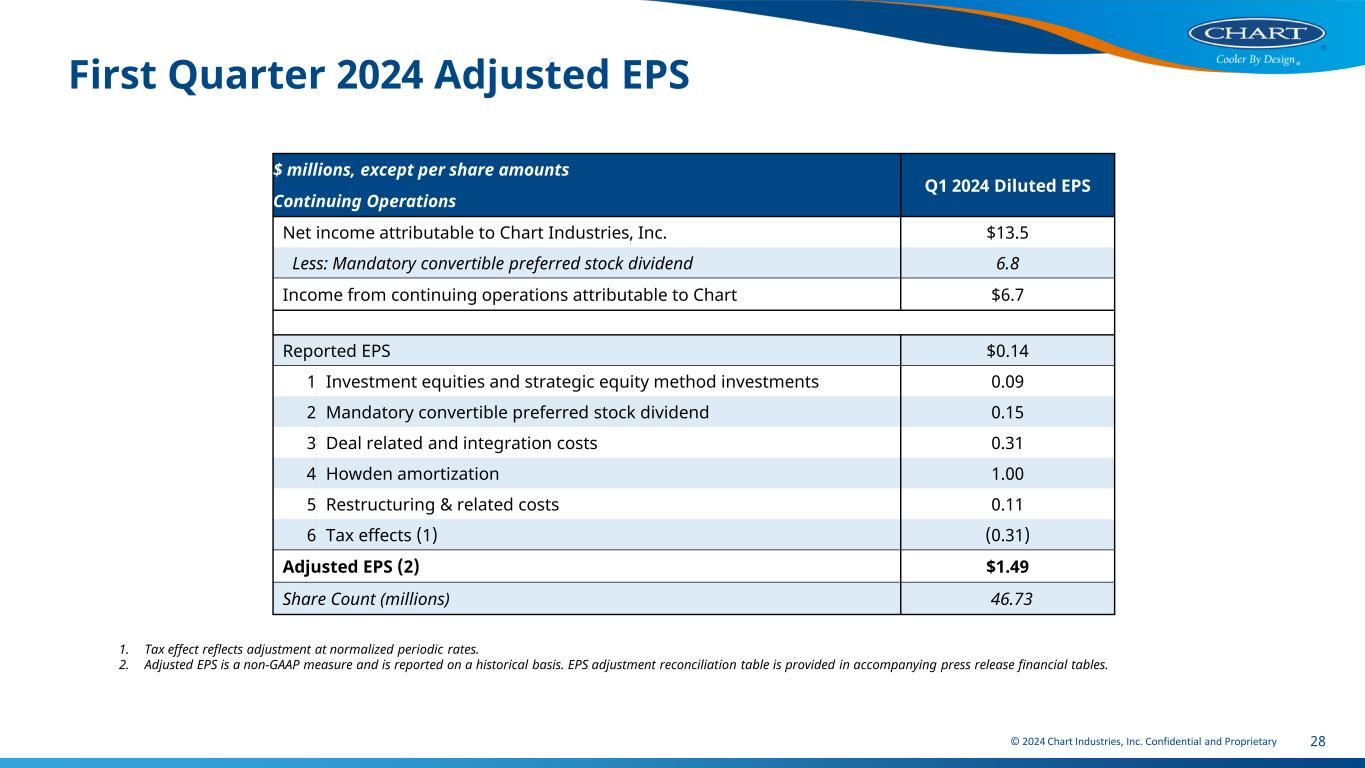 © 2024 Chart Industries, Inc. Confidential and Proprietary 27 Q1 2024 Addback Detail Main Category Detailed Description Q1 2024 gross amount (+ added to / (-) reduced income) Impact to Operating Income 1 Mark-to-Market of inorganic investments & Strategic Equity Method Investments • McPhy MTM • Stabilis MTM • Minority investments, other (Cryomotive, Hylium and HTEC) 4.3 No, net income only 2 Howden deal, other divestitures, integration, restructuring and related expense • Integration costs • Third party support fees • Cost to achieve synergies • Net working capital settlements on divestitures 19.5 Yes, operating and net income 3 Amortization/ Depreciation • Howden Q1 amortization • Inventory and PPE Step-up 46.7 Yes, operating and net income 4 Tax effect on all above adjustments • Tax effect on gross adjustments as shown above (14.4) No, net income only