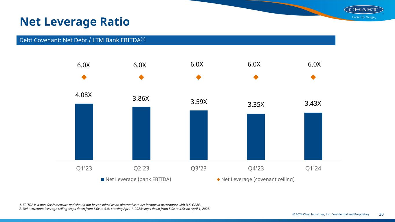 © 2024 Chart Industries, Inc. Confidential and Proprietary 29 First Quarter 2024 Adjusted EBITDA 1. EBITDA and Adjusted EBITDA are not measures of financial performance under U.S. GAAP and should not be considered as an alternative to net income in accordance with U.S. GAAP. Management believes that EBITDA and Adjusted EBITDA facilitate useful period-to-period comparisons of financial results and the information is used by us in evaluating our internal performance. 2. Non-recurring costs are primarily driven by Howden integration related activities. $ millions Consolidated Q1 2024 Net sales 950.7 Net income from continuing operations $16.8 Income tax expense, net 8.8 Interest expense, net 83.8 Depreciation and amortization 65.9 EBITDA (1) $175.3 Non-recurring costs 26.6 Employee share-based compensation 6.0 Unrealized loss on investments in equity securities and loss from strategic equity method investments and related Fx impacts 4.3 Adjusted EBITDA (1) $212.2 Adjusted EBITDA % of Sales 22.3%