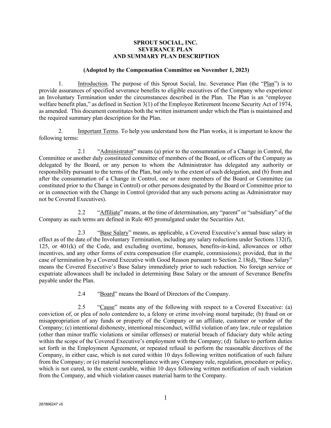 287866247 v5 1 SPROUT SOCIAL, INC. SEVERANCE PLAN AND SUMMARY PLAN DESCRIPTION (Adopted by the Compensation Committee on November 1, 2023) 1. Introduction. The purpose of this Sprout Social, Inc. Severance Plan (the “Plan”) is to provide assurances of specified severance benefits to eligible executives of the Company who experience an Involuntary Termination under the circumstances described in the Plan. The Plan is an “employee welfare benefit plan,” as defined in Section 3(1) of the Employee Retirement Income Security Act of 1974, as amended. This document constitutes both the written instrument under which the Plan is maintained and the required summary plan description for the Plan. 2. Important Terms. To help you understand how the Plan works, it is important to know the following terms: 2.1 “Administrator” means (a) prior to the consummation of a Change in Control, the Committee or another duly constituted committee of members of the Board, or officers of the Company as delegated by the Board, or any person to whom the Administrator has delegated any authority or responsibility pursuant to the terms of the Plan, but only to the extent of such delegation, and (b) from and after the consummation of a Change in Control, one or more members of the Board or Committee (as constituted prior to the Change in Control) or other persons designated by the Board or Committee prior to or in connection with the Change in Control (provided that any such persons acting as Administrator may not be Covered Executives). 2.2 “Affiliate” means, at the time of determination, any “parent” or “subsidiary” of the Company as such terms are defined in Rule 405 promulgated under the Securities Act. 2.3 “Base Salary” means, as applicable, a Covered Executive’s annual base salary in effect as of the date of the Involuntary Termination, including any salary reductions under Sections 132(f), 125, or 401(k) of the Code, and excluding overtime, bonuses, benefits-in-kind, allowances or other incentives, and any other forms of extra compensation (for example, commissions); provided, that in the case of termination by a Covered Executive with Good Reason pursuant to Section 2.18(d), “Base Salary” means the Covered Executive’s Base Salary immediately prior to such reduction. No foreign service or expatriate allowances shall be included in determining Base Salary or the amount of Severance Benefits payable under the Plan. 2.4 “Board” means the Board of Directors of the Company. 2.5 “Cause” means any of the following with respect to a Covered Executive: (a) conviction of, or plea of nolo contendere to, a felony or crime involving moral turpitude; (b) fraud on or misappropriation of any funds or property of the Company or an affiliate, customer or vendor of the Company; (c) intentional dishonesty, intentional misconduct, willful violation of any law, rule or regulation (other than minor traffic violations or similar offenses) or material breach of fiduciary duty while acting within the scope of the Covered Executive’s employment with the Company; (d) failure to perform duties set forth in the Employment Agreement, or repeated refusal to perform the reasonable directives of the Company, in either case, which is not cured within 10 days following written notification of such failure from the Company; or (e) material noncompliance with any Company rule, regulation, procedure or policy, which is not cured, to the extent curable, within 10 days following written notification of such violation from the Company, and which violation causes material harm to the Company.