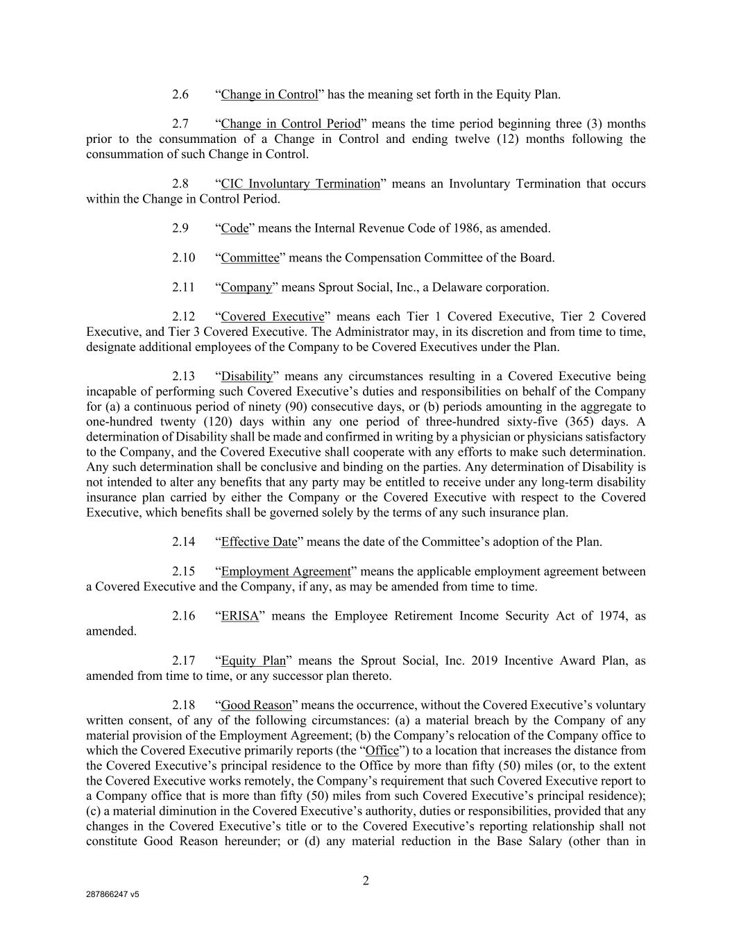 287866247 v5 2 2.6 “Change in Control” has the meaning set forth in the Equity Plan. 2.7 “Change in Control Period” means the time period beginning three (3) months prior to the consummation of a Change in Control and ending twelve (12) months following the consummation of such Change in Control. 2.8 “CIC Involuntary Termination” means an Involuntary Termination that occurs within the Change in Control Period. 2.9 “Code” means the Internal Revenue Code of 1986, as amended. 2.10 “Committee” means the Compensation Committee of the Board. 2.11 “Company” means Sprout Social, Inc., a Delaware corporation. 2.12 “Covered Executive” means each Tier 1 Covered Executive, Tier 2 Covered Executive, and Tier 3 Covered Executive. The Administrator may, in its discretion and from time to time, designate additional employees of the Company to be Covered Executives under the Plan. 2.13 “Disability” means any circumstances resulting in a Covered Executive being incapable of performing such Covered Executive’s duties and responsibilities on behalf of the Company for (a) a continuous period of ninety (90) consecutive days, or (b) periods amounting in the aggregate to one-hundred twenty (120) days within any one period of three-hundred sixty-five (365) days. A determination of Disability shall be made and confirmed in writing by a physician or physicians satisfactory to the Company, and the Covered Executive shall cooperate with any efforts to make such determination. Any such determination shall be conclusive and binding on the parties. Any determination of Disability is not intended to alter any benefits that any party may be entitled to receive under any long-term disability insurance plan carried by either the Company or the Covered Executive with respect to the Covered Executive, which benefits shall be governed solely by the terms of any such insurance plan. 2.14 “Effective Date” means the date of the Committee’s adoption of the Plan. 2.15 “Employment Agreement” means the applicable employment agreement between a Covered Executive and the Company, if any, as may be amended from time to time. 2.16 “ERISA” means the Employee Retirement Income Security Act of 1974, as amended. 2.17 “Equity Plan” means the Sprout Social, Inc. 2019 Incentive Award Plan, as amended from time to time, or any successor plan thereto. 2.18 “Good Reason” means the occurrence, without the Covered Executive’s voluntary written consent, of any of the following circumstances: (a) a material breach by the Company of any material provision of the Employment Agreement; (b) the Company’s relocation of the Company office to which the Covered Executive primarily reports (the “Office”) to a location that increases the distance from the Covered Executive’s principal residence to the Office by more than fifty (50) miles (or, to the extent the Covered Executive works remotely, the Company’s requirement that such Covered Executive report to a Company office that is more than fifty (50) miles from such Covered Executive’s principal residence); (c) a material diminution in the Covered Executive’s authority, duties or responsibilities, provided that any changes in the Covered Executive’s title or to the Covered Executive’s reporting relationship shall not constitute Good Reason hereunder; or (d) any material reduction in the Base Salary (other than in