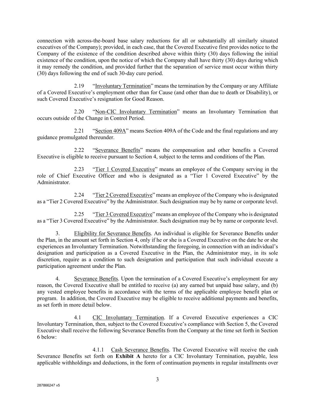 287866247 v5 3 connection with across-the-board base salary reductions for all or substantially all similarly situated executives of the Company); provided, in each case, that the Covered Executive first provides notice to the Company of the existence of the condition described above within thirty (30) days following the initial existence of the condition, upon the notice of which the Company shall have thirty (30) days during which it may remedy the condition, and provided further that the separation of service must occur within thirty (30) days following the end of such 30-day cure period. 2.19 “Involuntary Termination” means the termination by the Company or any Affiliate of a Covered Executive’s employment other than for Cause (and other than due to death or Disability), or such Covered Executive’s resignation for Good Reason. 2.20 “Non-CIC Involuntary Termination” means an Involuntary Termination that occurs outside of the Change in Control Period. 2.21 “Section 409A” means Section 409A of the Code and the final regulations and any guidance promulgated thereunder. 2.22 “Severance Benefits” means the compensation and other benefits a Covered Executive is eligible to receive pursuant to Section 4, subject to the terms and conditions of the Plan. 2.23 “Tier 1 Covered Executive” means an employee of the Company serving in the role of Chief Executive Officer and who is designated as a “Tier 1 Covered Executive” by the Administrator. 2.24 “Tier 2 Covered Executive” means an employee of the Company who is designated as a “Tier 2 Covered Executive” by the Administrator. Such designation may be by name or corporate level. 2.25 “Tier 3 Covered Executive” means an employee of the Company who is designated as a “Tier 3 Covered Executive” by the Administrator. Such designation may be by name or corporate level. 3. Eligibility for Severance Benefits. An individual is eligible for Severance Benefits under the Plan, in the amount set forth in Section 4, only if he or she is a Covered Executive on the date he or she experiences an Involuntary Termination. Notwithstanding the foregoing, in connection with an individual’s designation and participation as a Covered Executive in the Plan, the Administrator may, in its sole discretion, require as a condition to such designation and participation that such individual execute a participation agreement under the Plan. 4. Severance Benefits. Upon the termination of a Covered Executive’s employment for any reason, the Covered Executive shall be entitled to receive (a) any earned but unpaid base salary, and (b) any vested employee benefits in accordance with the terms of the applicable employee benefit plan or program. In addition, the Covered Executive may be eligible to receive additional payments and benefits, as set forth in more detail below. 4.1 CIC Involuntary Termination. If a Covered Executive experiences a CIC Involuntary Termination, then, subject to the Covered Executive’s compliance with Section 5, the Covered Executive shall receive the following Severance Benefits from the Company at the time set forth in Section 6 below: 4.1.1 Cash Severance Benefits. The Covered Executive will receive the cash Severance Benefits set forth on Exhibit A hereto for a CIC Involuntary Termination, payable, less applicable withholdings and deductions, in the form of continuation payments in regular installments over