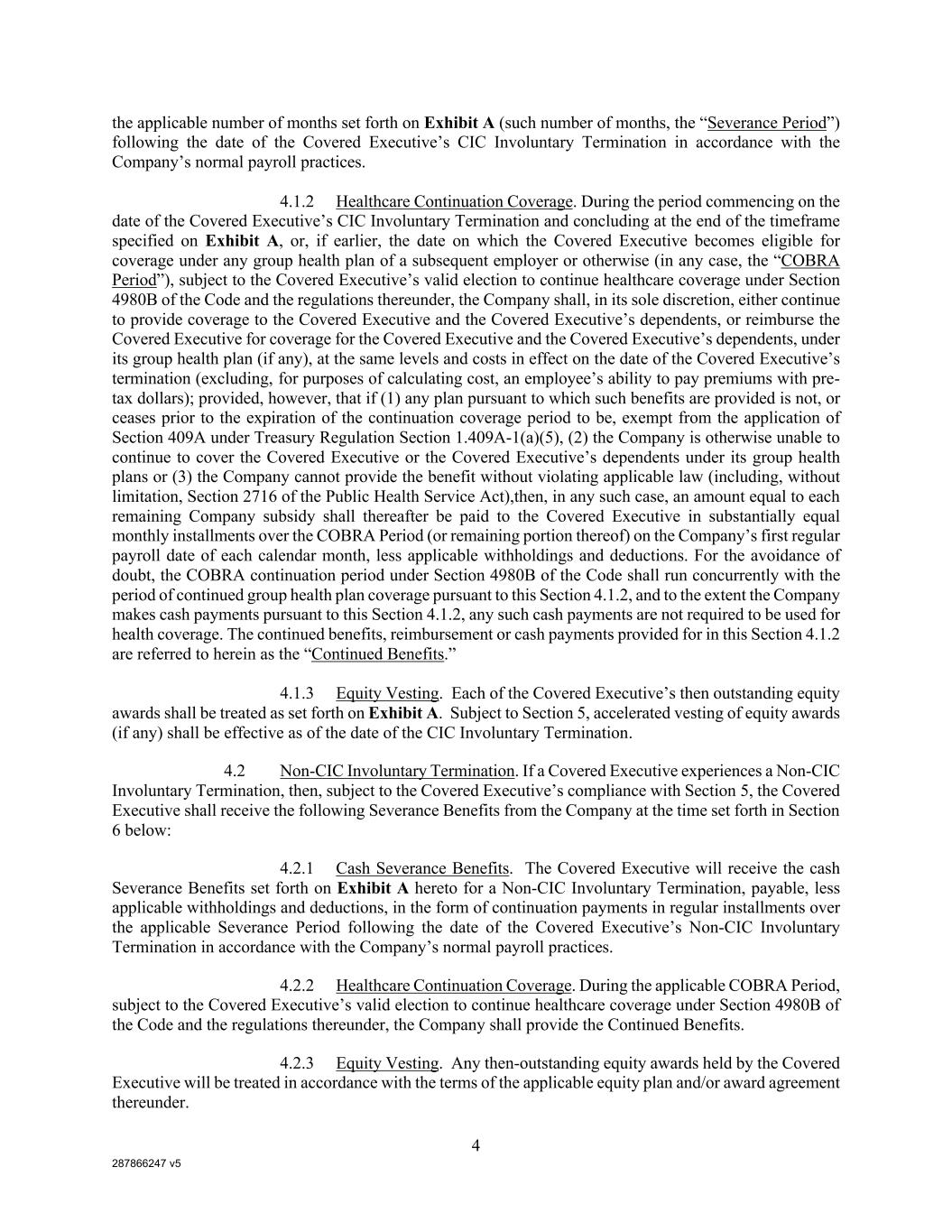 287866247 v5 4 the applicable number of months set forth on Exhibit A (such number of months, the “Severance Period”) following the date of the Covered Executive’s CIC Involuntary Termination in accordance with the Company’s normal payroll practices. 4.1.2 Healthcare Continuation Coverage. During the period commencing on the date of the Covered Executive’s CIC Involuntary Termination and concluding at the end of the timeframe specified on Exhibit A, or, if earlier, the date on which the Covered Executive becomes eligible for coverage under any group health plan of a subsequent employer or otherwise (in any case, the “COBRA Period”), subject to the Covered Executive’s valid election to continue healthcare coverage under Section 4980B of the Code and the regulations thereunder, the Company shall, in its sole discretion, either continue to provide coverage to the Covered Executive and the Covered Executive’s dependents, or reimburse the Covered Executive for coverage for the Covered Executive and the Covered Executive’s dependents, under its group health plan (if any), at the same levels and costs in effect on the date of the Covered Executive’s termination (excluding, for purposes of calculating cost, an employee’s ability to pay premiums with pre- tax dollars); provided, however, that if (1) any plan pursuant to which such benefits are provided is not, or ceases prior to the expiration of the continuation coverage period to be, exempt from the application of Section 409A under Treasury Regulation Section 1.409A-1(a)(5), (2) the Company is otherwise unable to continue to cover the Covered Executive or the Covered Executive’s dependents under its group health plans or (3) the Company cannot provide the benefit without violating applicable law (including, without limitation, Section 2716 of the Public Health Service Act),then, in any such case, an amount equal to each remaining Company subsidy shall thereafter be paid to the Covered Executive in substantially equal monthly installments over the COBRA Period (or remaining portion thereof) on the Company’s first regular payroll date of each calendar month, less applicable withholdings and deductions. For the avoidance of doubt, the COBRA continuation period under Section 4980B of the Code shall run concurrently with the period of continued group health plan coverage pursuant to this Section 4.1.2, and to the extent the Company makes cash payments pursuant to this Section 4.1.2, any such cash payments are not required to be used for health coverage. The continued benefits, reimbursement or cash payments provided for in this Section 4.1.2 are referred to herein as the “Continued Benefits.” 4.1.3 Equity Vesting. Each of the Covered Executive’s then outstanding equity awards shall be treated as set forth on Exhibit A. Subject to Section 5, accelerated vesting of equity awards (if any) shall be effective as of the date of the CIC Involuntary Termination. 4.2 Non-CIC Involuntary Termination. If a Covered Executive experiences a Non-CIC Involuntary Termination, then, subject to the Covered Executive’s compliance with Section 5, the Covered Executive shall receive the following Severance Benefits from the Company at the time set forth in Section 6 below: 4.2.1 Cash Severance Benefits. The Covered Executive will receive the cash Severance Benefits set forth on Exhibit A hereto for a Non-CIC Involuntary Termination, payable, less applicable withholdings and deductions, in the form of continuation payments in regular installments over the applicable Severance Period following the date of the Covered Executive’s Non-CIC Involuntary Termination in accordance with the Company’s normal payroll practices. 4.2.2 Healthcare Continuation Coverage. During the applicable COBRA Period, subject to the Covered Executive’s valid election to continue healthcare coverage under Section 4980B of the Code and the regulations thereunder, the Company shall provide the Continued Benefits. 4.2.3 Equity Vesting. Any then-outstanding equity awards held by the Covered Executive will be treated in accordance with the terms of the applicable equity plan and/or award agreement thereunder.