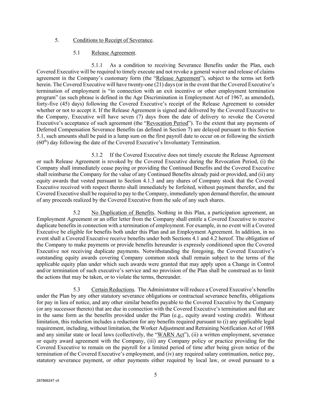 287866247 v5 5 5. Conditions to Receipt of Severance. 5.1 Release Agreement. 5.1.1 As a condition to receiving Severance Benefits under the Plan, each Covered Executive will be required to timely execute and not revoke a general waiver and release of claims agreement in the Company’s customary form (the “Release Agreement”), subject to the terms set forth herein. The Covered Executive will have twenty-one (21) days (or in the event that the Covered Executive’s termination of employment is “in connection with an exit incentive or other employment termination program” (as such phrase is defined in the Age Discrimination in Employment Act of 1967, as amended), forty-five (45) days) following the Covered Executive’s receipt of the Release Agreement to consider whether or not to accept it. If the Release Agreement is signed and delivered by the Covered Executive to the Company, Executive will have seven (7) days from the date of delivery to revoke the Covered Executive’s acceptance of such agreement (the “Revocation Period”). To the extent that any payments of Deferred Compensation Severance Benefits (as defined in Section 7) are delayed pursuant to this Section 5.1, such amounts shall be paid in a lump sum on the first payroll date to occur on or following the sixtieth (60th) day following the date of the Covered Executive’s Involuntary Termination. 5.1.2 If the Covered Executive does not timely execute the Release Agreement or such Release Agreement is revoked by the Covered Executive during the Revocation Period, (i) the Company shall immediately cease paying or providing the Continued Benefits and the Covered Executive shall reimburse the Company for the value of any Continued Benefits already paid or provided, and (ii) any equity awards that vested pursuant to Section 4.1.3 and any shares of Company stock that the Covered Executive received with respect thereto shall immediately be forfeited, without payment therefor, and the Covered Executive shall be required to pay to the Company, immediately upon demand therefor, the amount of any proceeds realized by the Covered Executive from the sale of any such shares. 5.2 No Duplication of Benefits. Nothing in this Plan, a participation agreement, an Employment Agreement or an offer letter from the Company shall entitle a Covered Executive to receive duplicate benefits in connection with a termination of employment. For example, in no event will a Covered Executive be eligible for benefits both under this Plan and an Employment Agreement. In addition, in no event shall a Covered Executive receive benefits under both Sections 4.1 and 4.2 hereof. The obligation of the Company to make payments or provide benefits hereunder is expressly conditioned upon the Covered Executive not receiving duplicate payments. Notwithstanding the foregoing, the Covered Executive’s outstanding equity awards covering Company common stock shall remain subject to the terms of the applicable equity plan under which such awards were granted that may apply upon a Change in Control and/or termination of such executive’s service and no provision of the Plan shall be construed as to limit the actions that may be taken, or to violate the terms, thereunder. 5.3 Certain Reductions. The Administrator will reduce a Covered Executive’s benefits under the Plan by any other statutory severance obligations or contractual severance benefits, obligations for pay in lieu of notice, and any other similar benefits payable to the Covered Executive by the Company (or any successor thereto) that are due in connection with the Covered Executive’s termination and that are in the same form as the benefits provided under the Plan (e.g., equity award vesting credit). Without limitation, this reduction includes a reduction for any benefits required pursuant to (i) any applicable legal requirement, including, without limitation, the Worker Adjustment and Retraining Notification Act of 1988 and any similar state or local laws (collectively, the “WARN Act”), (ii) a written employment, severance or equity award agreement with the Company, (iii) any Company policy or practice providing for the Covered Executive to remain on the payroll for a limited period of time after being given notice of the termination of the Covered Executive’s employment, and (iv) any required salary continuation, notice pay, statutory severance payment, or other payments either required by local law, or owed pursuant to a