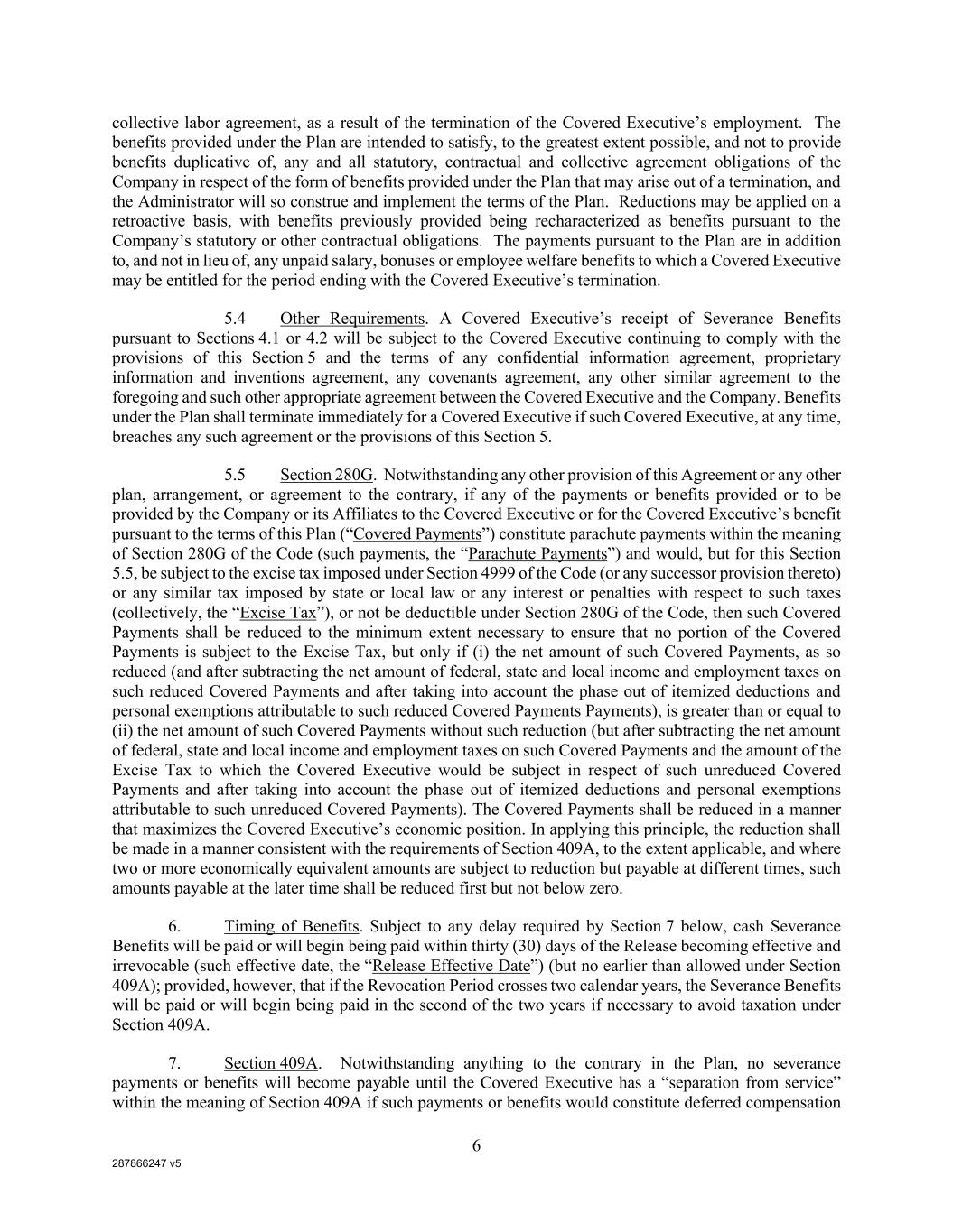 287866247 v5 6 collective labor agreement, as a result of the termination of the Covered Executive’s employment. The benefits provided under the Plan are intended to satisfy, to the greatest extent possible, and not to provide benefits duplicative of, any and all statutory, contractual and collective agreement obligations of the Company in respect of the form of benefits provided under the Plan that may arise out of a termination, and the Administrator will so construe and implement the terms of the Plan. Reductions may be applied on a retroactive basis, with benefits previously provided being recharacterized as benefits pursuant to the Company’s statutory or other contractual obligations. The payments pursuant to the Plan are in addition to, and not in lieu of, any unpaid salary, bonuses or employee welfare benefits to which a Covered Executive may be entitled for the period ending with the Covered Executive’s termination. 5.4 Other Requirements. A Covered Executive’s receipt of Severance Benefits pursuant to Sections 4.1 or 4.2 will be subject to the Covered Executive continuing to comply with the provisions of this Section 5 and the terms of any confidential information agreement, proprietary information and inventions agreement, any covenants agreement, any other similar agreement to the foregoing and such other appropriate agreement between the Covered Executive and the Company. Benefits under the Plan shall terminate immediately for a Covered Executive if such Covered Executive, at any time, breaches any such agreement or the provisions of this Section 5. 5.5 Section 280G. Notwithstanding any other provision of this Agreement or any other plan, arrangement, or agreement to the contrary, if any of the payments or benefits provided or to be provided by the Company or its Affiliates to the Covered Executive or for the Covered Executive’s benefit pursuant to the terms of this Plan (“Covered Payments”) constitute parachute payments within the meaning of Section 280G of the Code (such payments, the “Parachute Payments”) and would, but for this Section 5.5, be subject to the excise tax imposed under Section 4999 of the Code (or any successor provision thereto) or any similar tax imposed by state or local law or any interest or penalties with respect to such taxes (collectively, the “Excise Tax”), or not be deductible under Section 280G of the Code, then such Covered Payments shall be reduced to the minimum extent necessary to ensure that no portion of the Covered Payments is subject to the Excise Tax, but only if (i) the net amount of such Covered Payments, as so reduced (and after subtracting the net amount of federal, state and local income and employment taxes on such reduced Covered Payments and after taking into account the phase out of itemized deductions and personal exemptions attributable to such reduced Covered Payments Payments), is greater than or equal to (ii) the net amount of such Covered Payments without such reduction (but after subtracting the net amount of federal, state and local income and employment taxes on such Covered Payments and the amount of the Excise Tax to which the Covered Executive would be subject in respect of such unreduced Covered Payments and after taking into account the phase out of itemized deductions and personal exemptions attributable to such unreduced Covered Payments). The Covered Payments shall be reduced in a manner that maximizes the Covered Executive’s economic position. In applying this principle, the reduction shall be made in a manner consistent with the requirements of Section 409A, to the extent applicable, and where two or more economically equivalent amounts are subject to reduction but payable at different times, such amounts payable at the later time shall be reduced first but not below zero. 6. Timing of Benefits. Subject to any delay required by Section 7 below, cash Severance Benefits will be paid or will begin being paid within thirty (30) days of the Release becoming effective and irrevocable (such effective date, the “Release Effective Date”) (but no earlier than allowed under Section 409A); provided, however, that if the Revocation Period crosses two calendar years, the Severance Benefits will be paid or will begin being paid in the second of the two years if necessary to avoid taxation under Section 409A. 7. Section 409A. Notwithstanding anything to the contrary in the Plan, no severance payments or benefits will become payable until the Covered Executive has a “separation from service” within the meaning of Section 409A if such payments or benefits would constitute deferred compensation