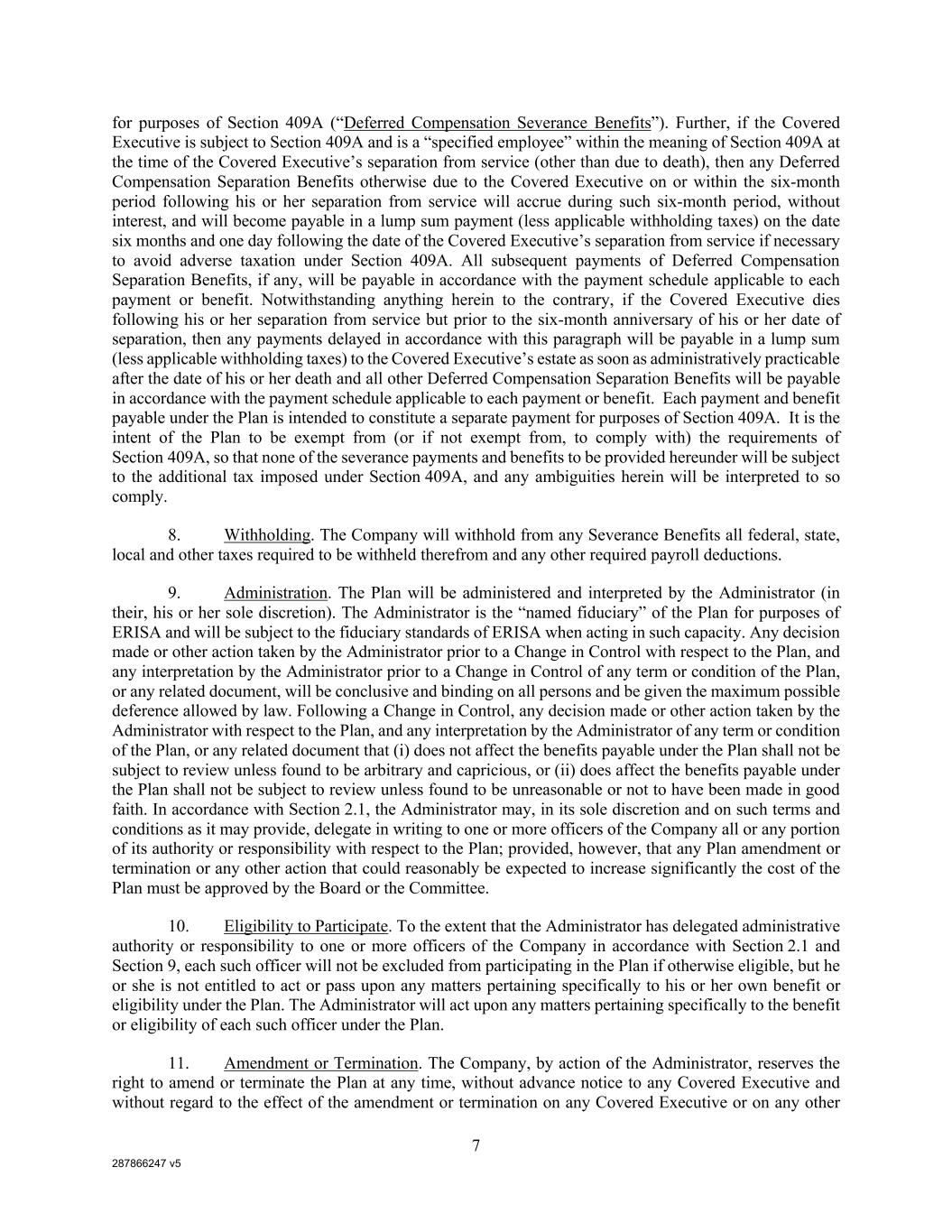 287866247 v5 7 for purposes of Section 409A (“Deferred Compensation Severance Benefits”). Further, if the Covered Executive is subject to Section 409A and is a “specified employee” within the meaning of Section 409A at the time of the Covered Executive’s separation from service (other than due to death), then any Deferred Compensation Separation Benefits otherwise due to the Covered Executive on or within the six-month period following his or her separation from service will accrue during such six-month period, without interest, and will become payable in a lump sum payment (less applicable withholding taxes) on the date six months and one day following the date of the Covered Executive’s separation from service if necessary to avoid adverse taxation under Section 409A. All subsequent payments of Deferred Compensation Separation Benefits, if any, will be payable in accordance with the payment schedule applicable to each payment or benefit. Notwithstanding anything herein to the contrary, if the Covered Executive dies following his or her separation from service but prior to the six-month anniversary of his or her date of separation, then any payments delayed in accordance with this paragraph will be payable in a lump sum (less applicable withholding taxes) to the Covered Executive’s estate as soon as administratively practicable after the date of his or her death and all other Deferred Compensation Separation Benefits will be payable in accordance with the payment schedule applicable to each payment or benefit. Each payment and benefit payable under the Plan is intended to constitute a separate payment for purposes of Section 409A. It is the intent of the Plan to be exempt from (or if not exempt from, to comply with) the requirements of Section 409A, so that none of the severance payments and benefits to be provided hereunder will be subject to the additional tax imposed under Section 409A, and any ambiguities herein will be interpreted to so comply. 8. Withholding. The Company will withhold from any Severance Benefits all federal, state, local and other taxes required to be withheld therefrom and any other required payroll deductions. 9. Administration. The Plan will be administered and interpreted by the Administrator (in their, his or her sole discretion). The Administrator is the “named fiduciary” of the Plan for purposes of ERISA and will be subject to the fiduciary standards of ERISA when acting in such capacity. Any decision made or other action taken by the Administrator prior to a Change in Control with respect to the Plan, and any interpretation by the Administrator prior to a Change in Control of any term or condition of the Plan, or any related document, will be conclusive and binding on all persons and be given the maximum possible deference allowed by law. Following a Change in Control, any decision made or other action taken by the Administrator with respect to the Plan, and any interpretation by the Administrator of any term or condition of the Plan, or any related document that (i) does not affect the benefits payable under the Plan shall not be subject to review unless found to be arbitrary and capricious, or (ii) does affect the benefits payable under the Plan shall not be subject to review unless found to be unreasonable or not to have been made in good faith. In accordance with Section 2.1, the Administrator may, in its sole discretion and on such terms and conditions as it may provide, delegate in writing to one or more officers of the Company all or any portion of its authority or responsibility with respect to the Plan; provided, however, that any Plan amendment or termination or any other action that could reasonably be expected to increase significantly the cost of the Plan must be approved by the Board or the Committee. 10. Eligibility to Participate. To the extent that the Administrator has delegated administrative authority or responsibility to one or more officers of the Company in accordance with Section 2.1 and Section 9, each such officer will not be excluded from participating in the Plan if otherwise eligible, but he or she is not entitled to act or pass upon any matters pertaining specifically to his or her own benefit or eligibility under the Plan. The Administrator will act upon any matters pertaining specifically to the benefit or eligibility of each such officer under the Plan. 11. Amendment or Termination. The Company, by action of the Administrator, reserves the right to amend or terminate the Plan at any time, without advance notice to any Covered Executive and without regard to the effect of the amendment or termination on any Covered Executive or on any other