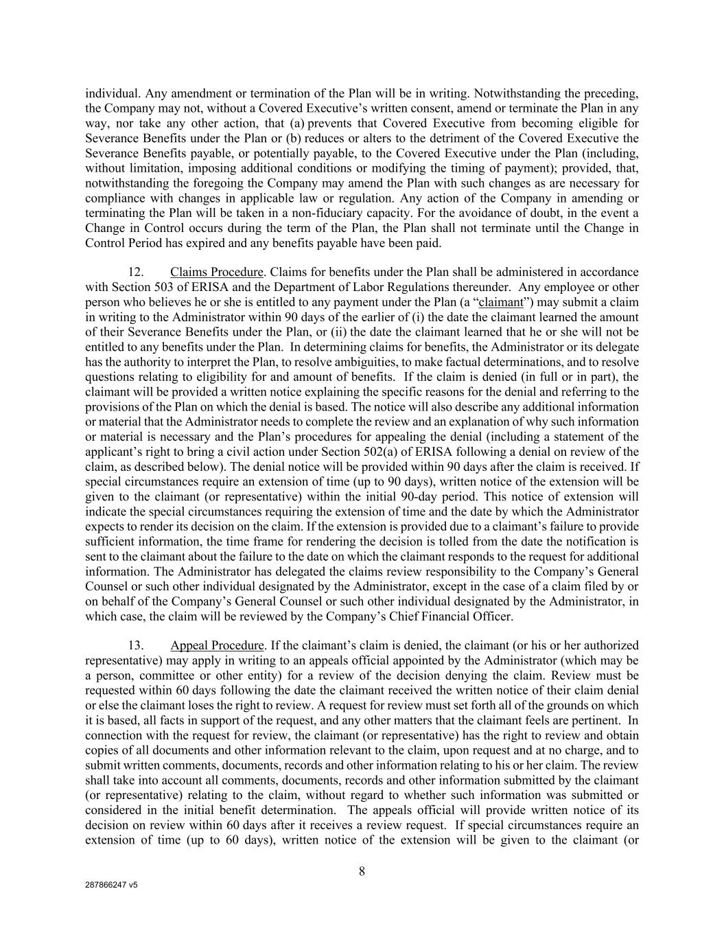 287866247 v5 8 individual. Any amendment or termination of the Plan will be in writing. Notwithstanding the preceding, the Company may not, without a Covered Executive’s written consent, amend or terminate the Plan in any way, nor take any other action, that (a) prevents that Covered Executive from becoming eligible for Severance Benefits under the Plan or (b) reduces or alters to the detriment of the Covered Executive the Severance Benefits payable, or potentially payable, to the Covered Executive under the Plan (including, without limitation, imposing additional conditions or modifying the timing of payment); provided, that, notwithstanding the foregoing the Company may amend the Plan with such changes as are necessary for compliance with changes in applicable law or regulation. Any action of the Company in amending or terminating the Plan will be taken in a non-fiduciary capacity. For the avoidance of doubt, in the event a Change in Control occurs during the term of the Plan, the Plan shall not terminate until the Change in Control Period has expired and any benefits payable have been paid. 12. Claims Procedure. Claims for benefits under the Plan shall be administered in accordance with Section 503 of ERISA and the Department of Labor Regulations thereunder. Any employee or other person who believes he or she is entitled to any payment under the Plan (a “claimant”) may submit a claim in writing to the Administrator within 90 days of the earlier of (i) the date the claimant learned the amount of their Severance Benefits under the Plan, or (ii) the date the claimant learned that he or she will not be entitled to any benefits under the Plan. In determining claims for benefits, the Administrator or its delegate has the authority to interpret the Plan, to resolve ambiguities, to make factual determinations, and to resolve questions relating to eligibility for and amount of benefits. If the claim is denied (in full or in part), the claimant will be provided a written notice explaining the specific reasons for the denial and referring to the provisions of the Plan on which the denial is based. The notice will also describe any additional information or material that the Administrator needs to complete the review and an explanation of why such information or material is necessary and the Plan’s procedures for appealing the denial (including a statement of the applicant’s right to bring a civil action under Section 502(a) of ERISA following a denial on review of the claim, as described below). The denial notice will be provided within 90 days after the claim is received. If special circumstances require an extension of time (up to 90 days), written notice of the extension will be given to the claimant (or representative) within the initial 90-day period. This notice of extension will indicate the special circumstances requiring the extension of time and the date by which the Administrator expects to render its decision on the claim. If the extension is provided due to a claimant’s failure to provide sufficient information, the time frame for rendering the decision is tolled from the date the notification is sent to the claimant about the failure to the date on which the claimant responds to the request for additional information. The Administrator has delegated the claims review responsibility to the Company’s General Counsel or such other individual designated by the Administrator, except in the case of a claim filed by or on behalf of the Company’s General Counsel or such other individual designated by the Administrator, in which case, the claim will be reviewed by the Company’s Chief Financial Officer. 13. Appeal Procedure. If the claimant’s claim is denied, the claimant (or his or her authorized representative) may apply in writing to an appeals official appointed by the Administrator (which may be a person, committee or other entity) for a review of the decision denying the claim. Review must be requested within 60 days following the date the claimant received the written notice of their claim denial or else the claimant loses the right to review. A request for review must set forth all of the grounds on which it is based, all facts in support of the request, and any other matters that the claimant feels are pertinent. In connection with the request for review, the claimant (or representative) has the right to review and obtain copies of all documents and other information relevant to the claim, upon request and at no charge, and to submit written comments, documents, records and other information relating to his or her claim. The review shall take into account all comments, documents, records and other information submitted by the claimant (or representative) relating to the claim, without regard to whether such information was submitted or considered in the initial benefit determination. The appeals official will provide written notice of its decision on review within 60 days after it receives a review request. If special circumstances require an extension of time (up to 60 days), written notice of the extension will be given to the claimant (or
