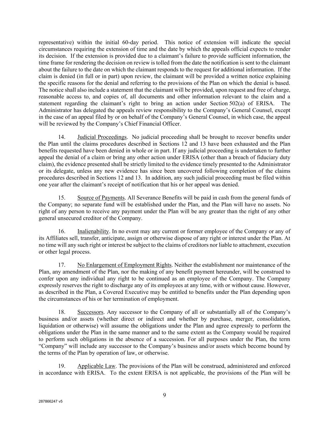 287866247 v5 9 representative) within the initial 60-day period. This notice of extension will indicate the special circumstances requiring the extension of time and the date by which the appeals official expects to render its decision. If the extension is provided due to a claimant’s failure to provide sufficient information, the time frame for rendering the decision on review is tolled from the date the notification is sent to the claimant about the failure to the date on which the claimant responds to the request for additional information. If the claim is denied (in full or in part) upon review, the claimant will be provided a written notice explaining the specific reasons for the denial and referring to the provisions of the Plan on which the denial is based. The notice shall also include a statement that the claimant will be provided, upon request and free of charge, reasonable access to, and copies of, all documents and other information relevant to the claim and a statement regarding the claimant’s right to bring an action under Section 502(a) of ERISA. The Administrator has delegated the appeals review responsibility to the Company’s General Counsel, except in the case of an appeal filed by or on behalf of the Company’s General Counsel, in which case, the appeal will be reviewed by the Company’s Chief Financial Officer. 14. Judicial Proceedings. No judicial proceeding shall be brought to recover benefits under the Plan until the claims procedures described in Sections 12 and 13 have been exhausted and the Plan benefits requested have been denied in whole or in part. If any judicial proceeding is undertaken to further appeal the denial of a claim or bring any other action under ERISA (other than a breach of fiduciary duty claim), the evidence presented shall be strictly limited to the evidence timely presented to the Administrator or its delegate, unless any new evidence has since been uncovered following completion of the claims procedures described in Sections 12 and 13. In addition, any such judicial proceeding must be filed within one year after the claimant’s receipt of notification that his or her appeal was denied. 15. Source of Payments. All Severance Benefits will be paid in cash from the general funds of the Company; no separate fund will be established under the Plan, and the Plan will have no assets. No right of any person to receive any payment under the Plan will be any greater than the right of any other general unsecured creditor of the Company. 16. Inalienability. In no event may any current or former employee of the Company or any of its Affiliates sell, transfer, anticipate, assign or otherwise dispose of any right or interest under the Plan. At no time will any such right or interest be subject to the claims of creditors nor liable to attachment, execution or other legal process. 17. No Enlargement of Employment Rights. Neither the establishment nor maintenance of the Plan, any amendment of the Plan, nor the making of any benefit payment hereunder, will be construed to confer upon any individual any right to be continued as an employee of the Company. The Company expressly reserves the right to discharge any of its employees at any time, with or without cause. However, as described in the Plan, a Covered Executive may be entitled to benefits under the Plan depending upon the circumstances of his or her termination of employment. 18. Successors. Any successor to the Company of all or substantially all of the Company’s business and/or assets (whether direct or indirect and whether by purchase, merger, consolidation, liquidation or otherwise) will assume the obligations under the Plan and agree expressly to perform the obligations under the Plan in the same manner and to the same extent as the Company would be required to perform such obligations in the absence of a succession. For all purposes under the Plan, the term “Company” will include any successor to the Company’s business and/or assets which become bound by the terms of the Plan by operation of law, or otherwise. 19. Applicable Law. The provisions of the Plan will be construed, administered and enforced in accordance with ERISA. To the extent ERISA is not applicable, the provisions of the Plan will be