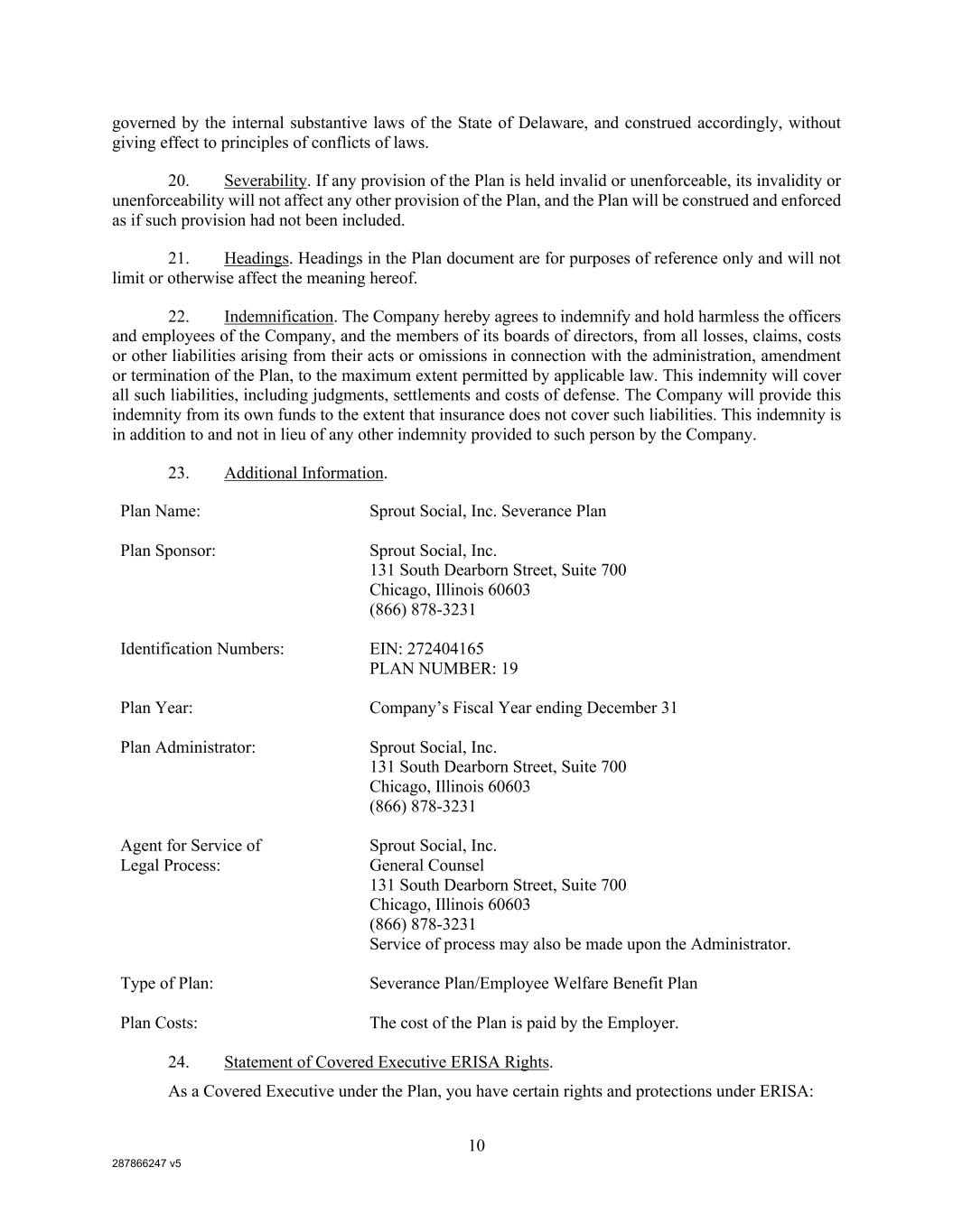 287866247 v5 10 governed by the internal substantive laws of the State of Delaware, and construed accordingly, without giving effect to principles of conflicts of laws. 20. Severability. If any provision of the Plan is held invalid or unenforceable, its invalidity or unenforceability will not affect any other provision of the Plan, and the Plan will be construed and enforced as if such provision had not been included. 21. Headings. Headings in the Plan document are for purposes of reference only and will not limit or otherwise affect the meaning hereof. 22. Indemnification. The Company hereby agrees to indemnify and hold harmless the officers and employees of the Company, and the members of its boards of directors, from all losses, claims, costs or other liabilities arising from their acts or omissions in connection with the administration, amendment or termination of the Plan, to the maximum extent permitted by applicable law. This indemnity will cover all such liabilities, including judgments, settlements and costs of defense. The Company will provide this indemnity from its own funds to the extent that insurance does not cover such liabilities. This indemnity is in addition to and not in lieu of any other indemnity provided to such person by the Company. 23. Additional Information. Plan Name: Sprout Social, Inc. Severance Plan Plan Sponsor: Sprout Social, Inc. 131 South Dearborn Street, Suite 700 Chicago, Illinois 60603 (866) 878-3231 Identification Numbers: EIN: 272404165 PLAN NUMBER: 19 Plan Year: Company’s Fiscal Year ending December 31 Plan Administrator: Sprout Social, Inc. 131 South Dearborn Street, Suite 700 Chicago, Illinois 60603 (866) 878-3231 Agent for Service of Sprout Social, Inc. General Counsel 131 South Dearborn Street, Suite 700 Chicago, Illinois 60603 (866) 878-3231 Legal Process: Service of process may also be made upon the Administrator. Type of Plan: Severance Plan/Employee Welfare Benefit Plan Plan Costs: The cost of the Plan is paid by the Employer. 24. Statement of Covered Executive ERISA Rights. As a Covered Executive under the Plan, you have certain rights and protections under ERISA: