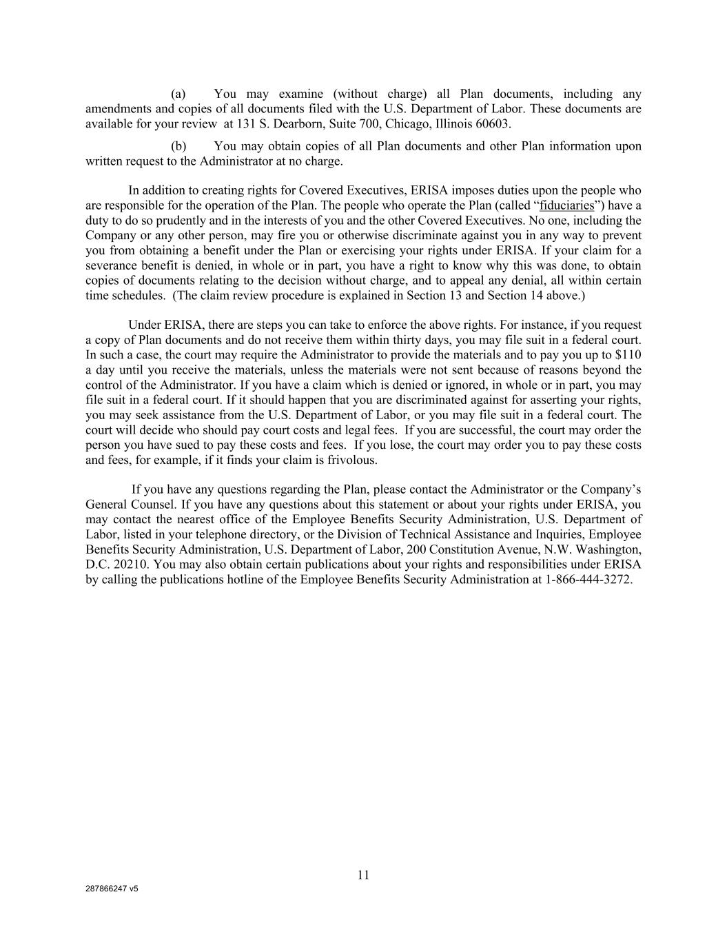 287866247 v5 11 (a) You may examine (without charge) all Plan documents, including any amendments and copies of all documents filed with the U.S. Department of Labor. These documents are available for your review at 131 S. Dearborn, Suite 700, Chicago, Illinois 60603. (b) You may obtain copies of all Plan documents and other Plan information upon written request to the Administrator at no charge. In addition to creating rights for Covered Executives, ERISA imposes duties upon the people who are responsible for the operation of the Plan. The people who operate the Plan (called “fiduciaries”) have a duty to do so prudently and in the interests of you and the other Covered Executives. No one, including the Company or any other person, may fire you or otherwise discriminate against you in any way to prevent you from obtaining a benefit under the Plan or exercising your rights under ERISA. If your claim for a severance benefit is denied, in whole or in part, you have a right to know why this was done, to obtain copies of documents relating to the decision without charge, and to appeal any denial, all within certain time schedules. (The claim review procedure is explained in Section 13 and Section 14 above.) Under ERISA, there are steps you can take to enforce the above rights. For instance, if you request a copy of Plan documents and do not receive them within thirty days, you may file suit in a federal court. In such a case, the court may require the Administrator to provide the materials and to pay you up to $110 a day until you receive the materials, unless the materials were not sent because of reasons beyond the control of the Administrator. If you have a claim which is denied or ignored, in whole or in part, you may file suit in a federal court. If it should happen that you are discriminated against for asserting your rights, you may seek assistance from the U.S. Department of Labor, or you may file suit in a federal court. The court will decide who should pay court costs and legal fees. If you are successful, the court may order the person you have sued to pay these costs and fees. If you lose, the court may order you to pay these costs and fees, for example, if it finds your claim is frivolous. If you have any questions regarding the Plan, please contact the Administrator or the Company’s General Counsel. If you have any questions about this statement or about your rights under ERISA, you may contact the nearest office of the Employee Benefits Security Administration, U.S. Department of Labor, listed in your telephone directory, or the Division of Technical Assistance and Inquiries, Employee Benefits Security Administration, U.S. Department of Labor, 200 Constitution Avenue, N.W. Washington, D.C. 20210. You may also obtain certain publications about your rights and responsibilities under ERISA by calling the publications hotline of the Employee Benefits Security Administration at 1-866-444-3272.
