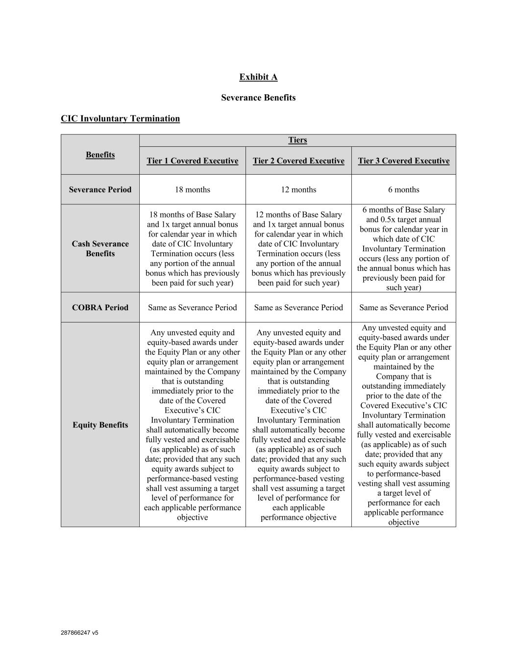 287866247 v5 Non-CIC Involuntary Termination Benefits Tiers Tier 1 Covered Executive Tier 2 Covered Executive Tier 3 Covered Executive Severance Period 12 months 6 months 3 months Cash Severance Benefits 12 months of Base Salary 6 months of Base Salary 3 months of Base Salary COBRA Period Same as Severance Period Same as Severance Period Same as Severance Period Equity Benefits N/A N/A N/A