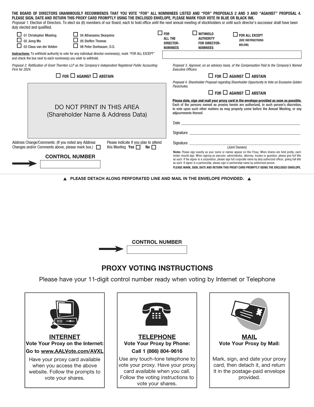 | ● | By internet or telephone. You may also vote over the internet at www.AALVote.com/AVXL or vote by telephone at 866.804.9616. Please see your proxy card for voting instructions. |